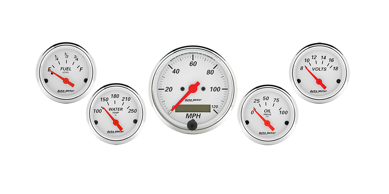 1601 Auto Meter Old Tyme White 5 Gauge Kit w/ Mechanical Speedometer (3 1/8″ & 2 1/16″)