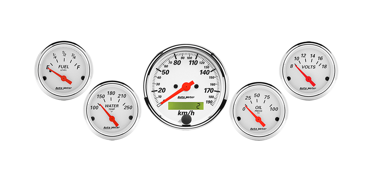 1300 Auto Meter Arctic White 5 Gauge Kit w/ Mechanical Speedometer (3 1/8″ & 2 1/16″)