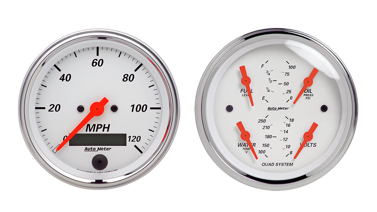 1620 Auto Meter Old Tyme White 2 Gauge Kit (3 3/8″ Speedometer/Tachometer & Quad)