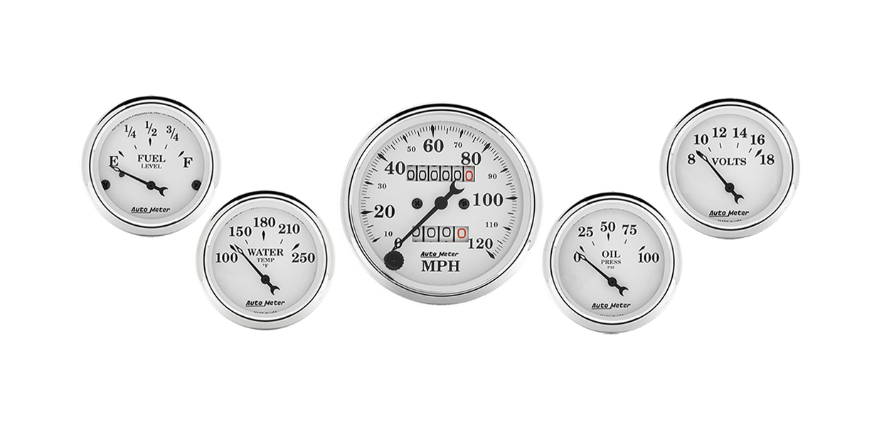 1601 Auto Meter Old Tyme White 5 Gauge Kit w/ Mechanical Speedometer (3 1/8″ & 2 1/16″)