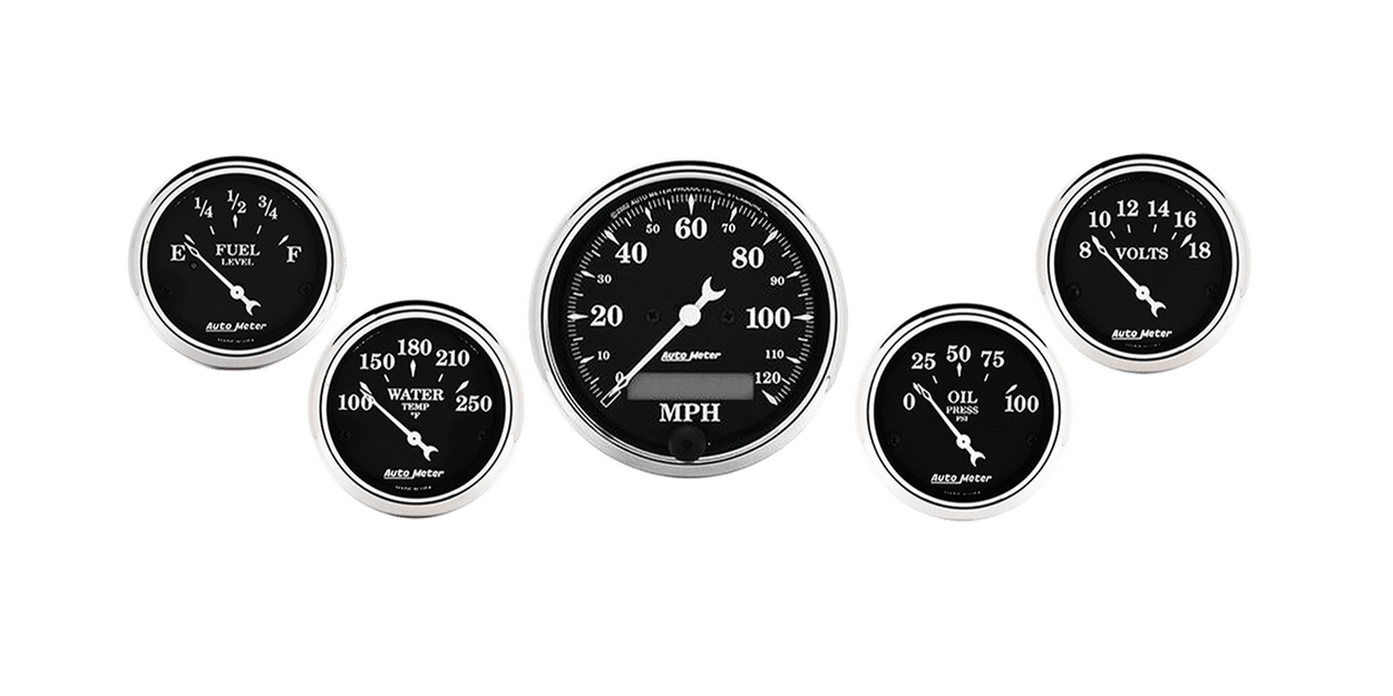 1708 Auto Meter Old Tyme Black 5 Gauge Kit w/ Mechanical Speedometer (3 1/8″ & 2 1/16″)