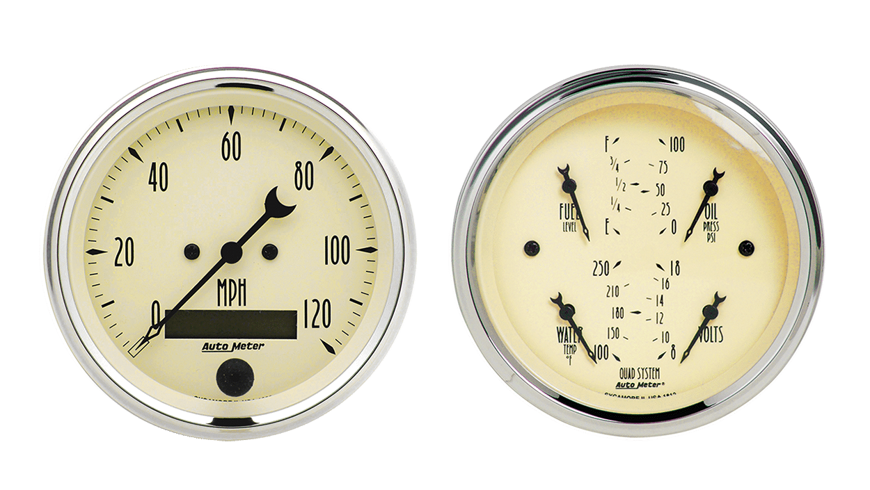 1800 Auto Meter Antique Beige 2 Gauge Kit (3 3/8″ Speedometer & Quad)