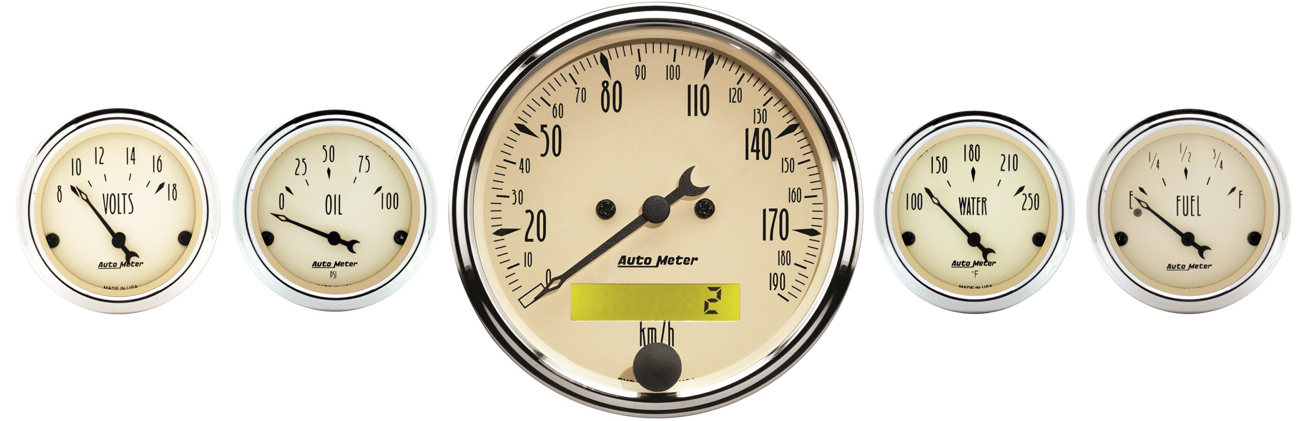 1809-M AutoMeter Antique Beige 5 Gauge Kit w/ 190 KPH Electric Speedometer (3 1/8″ & 2 1/16″)