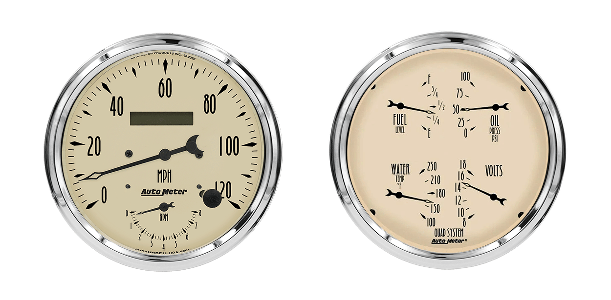 1852 Auto Meter Antique Beige 2 Gauge Kit (5″ Speedometer/Tachometer & Quad)