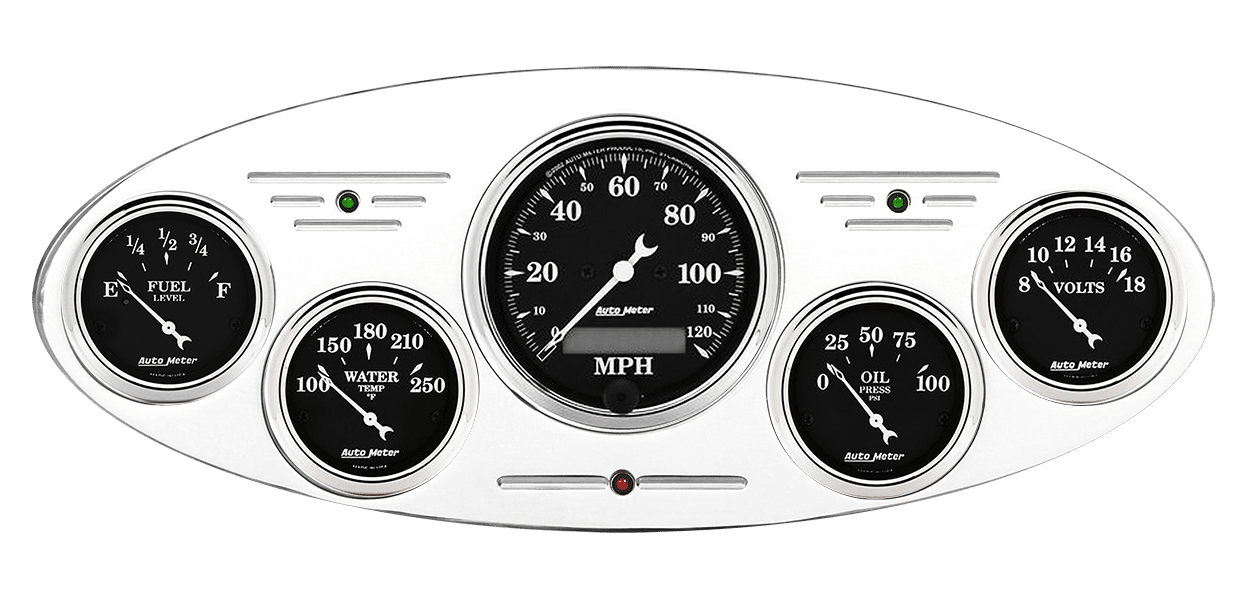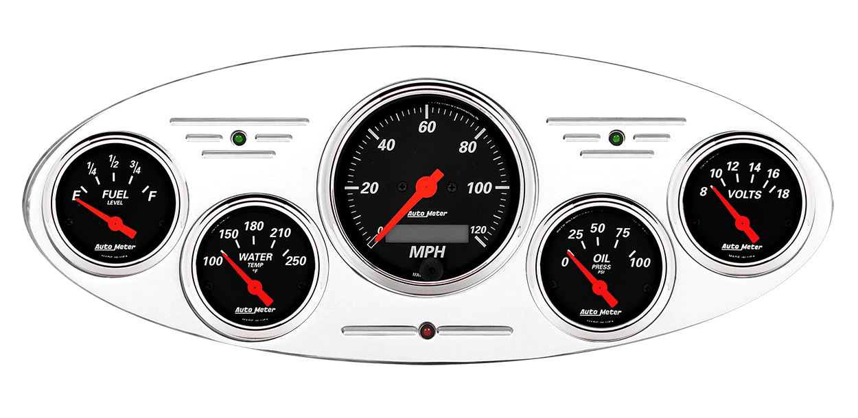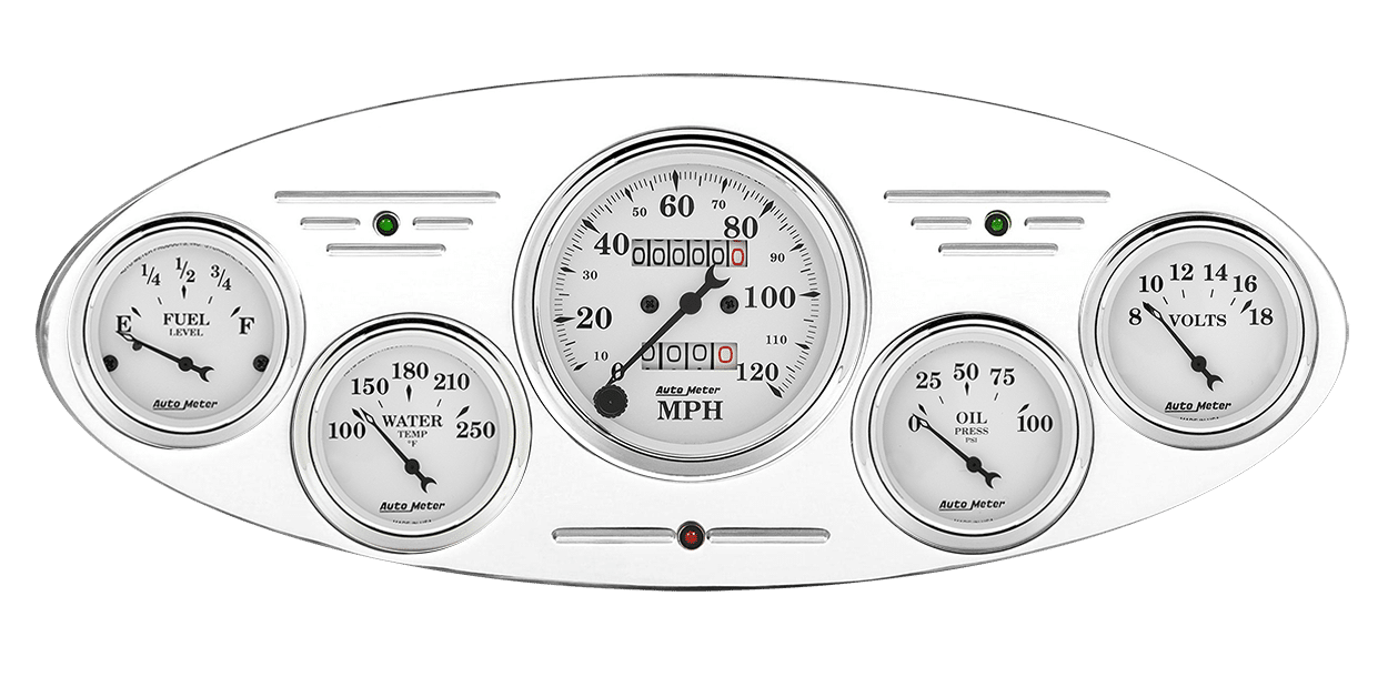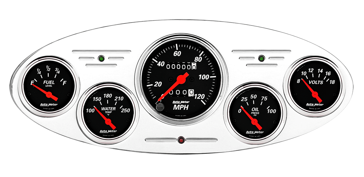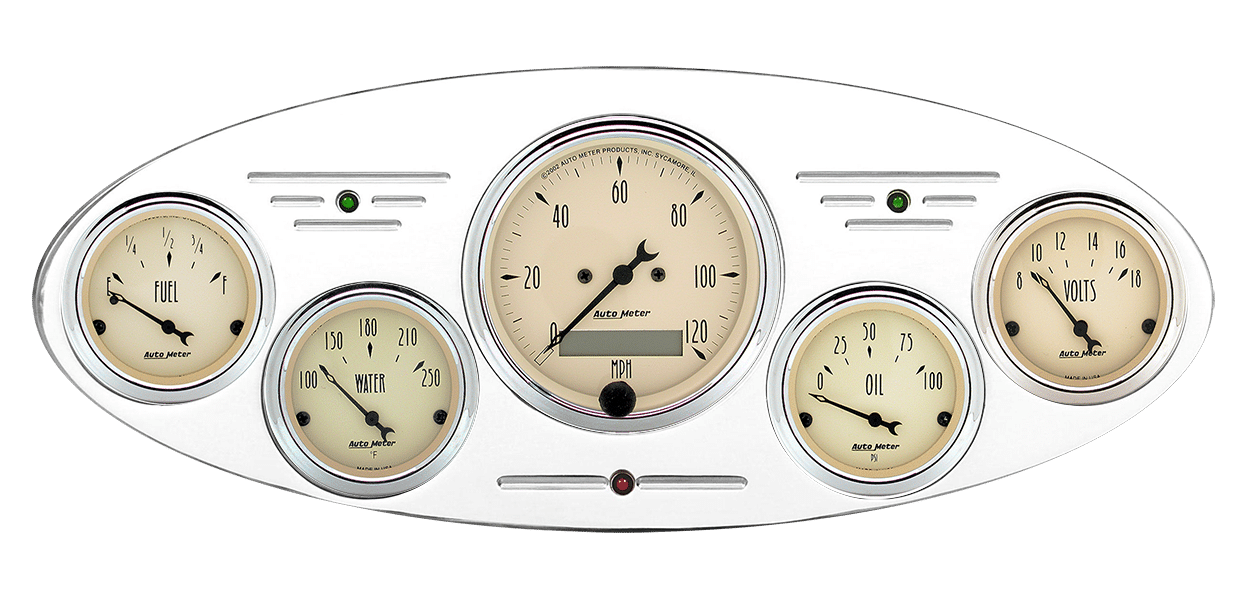 Includes aluminum dash insert, Auto Street Rod series gauges & turn signal/high beam indicators.