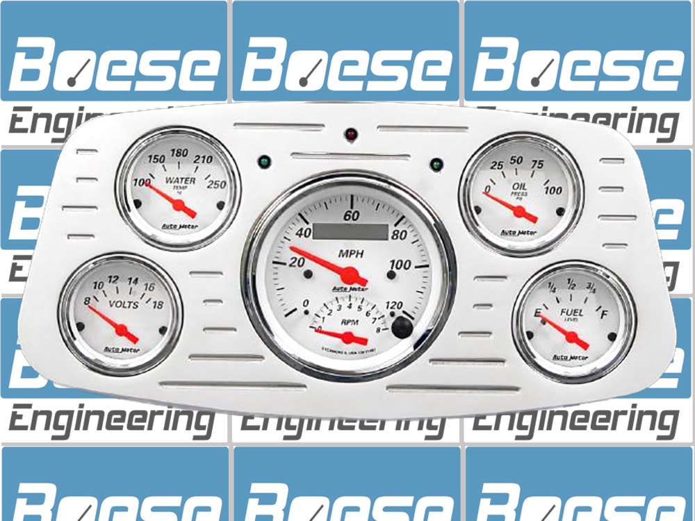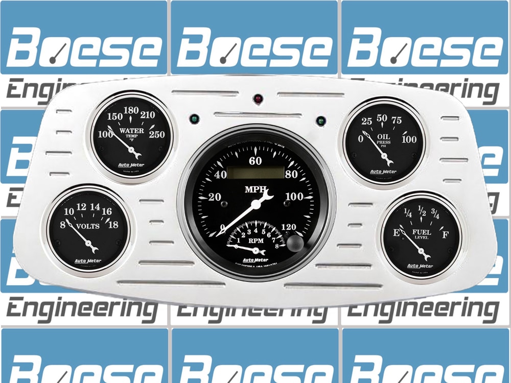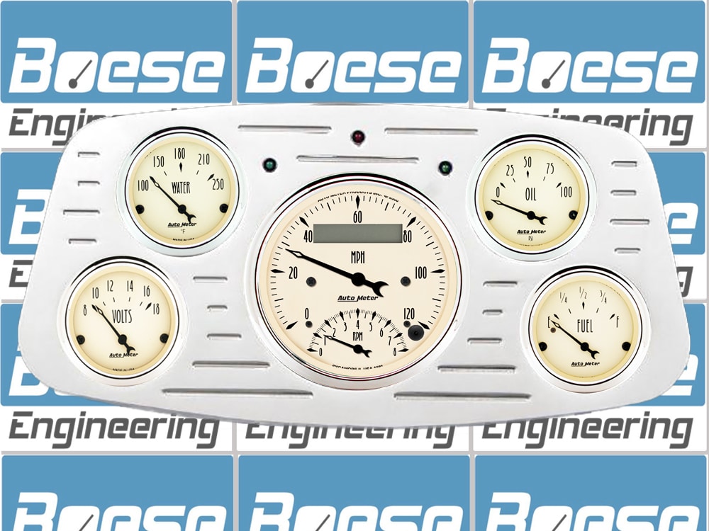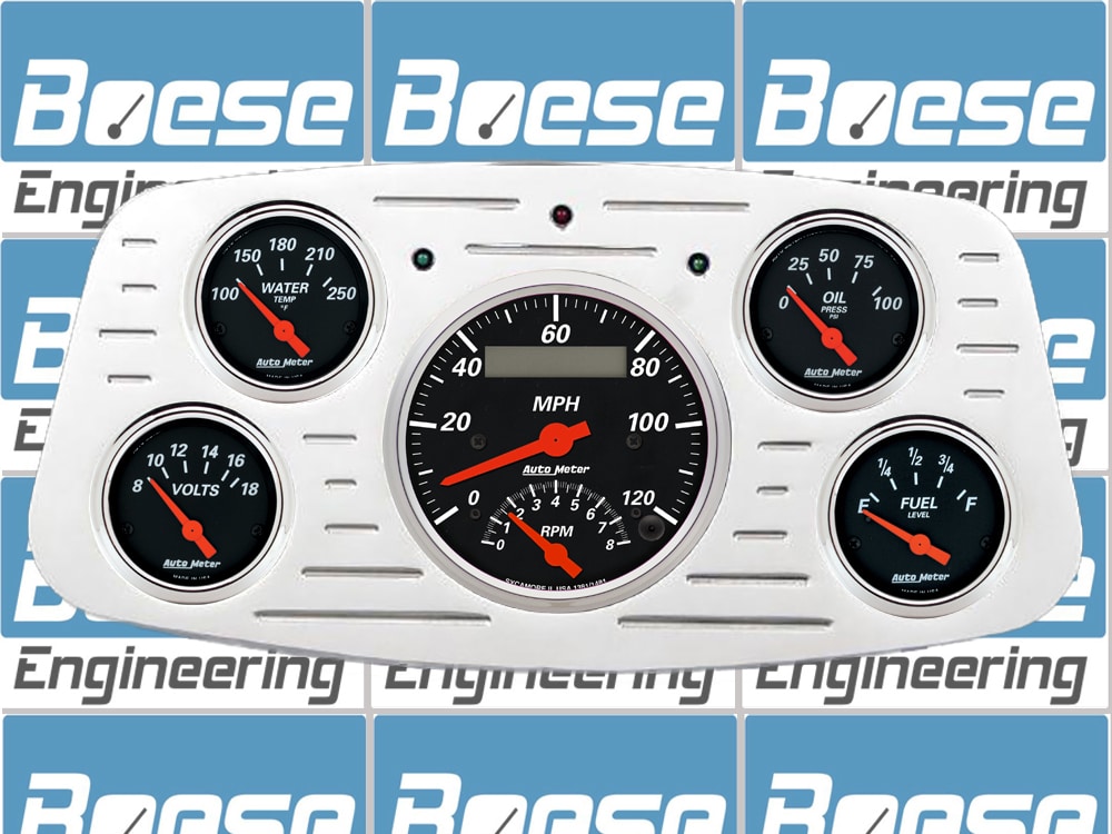 Includes aluminum dash insert, Auto Meter Street Rod series gauges and LED lights (turn signal & high beam indicators.).