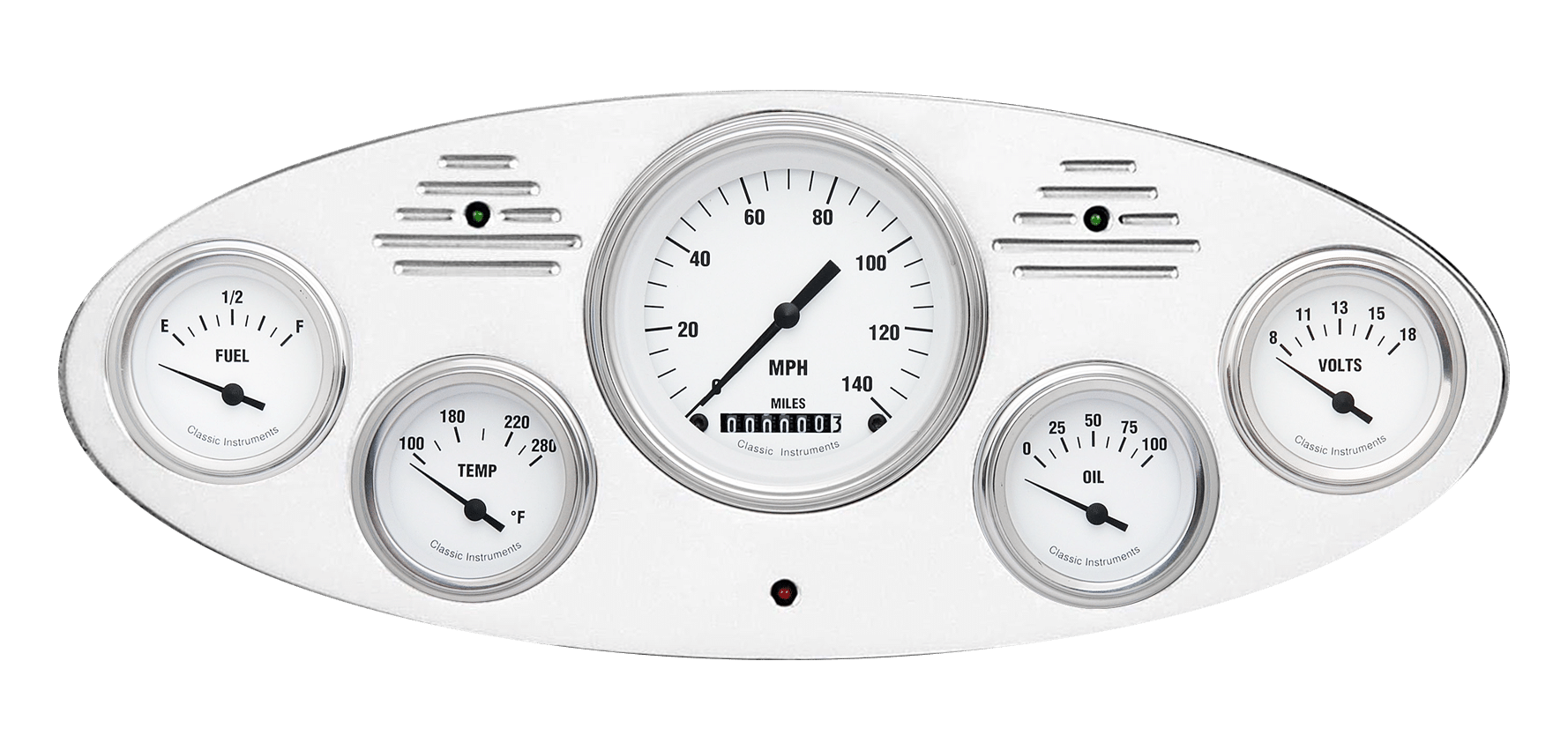 Includes aluminum dash insert, Classic Instruments gauges & LED lights (turn signal & high beam indicators).