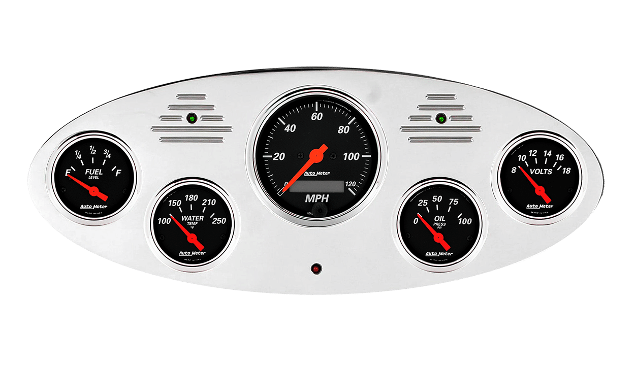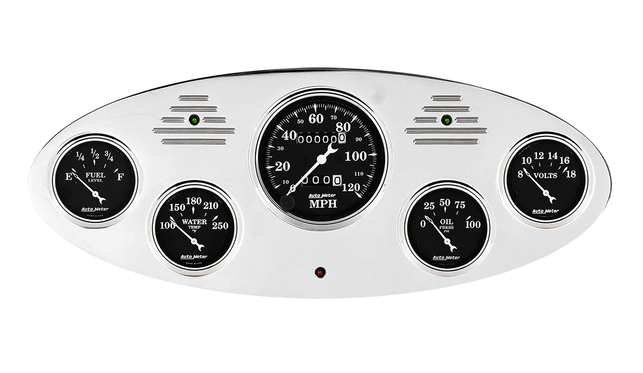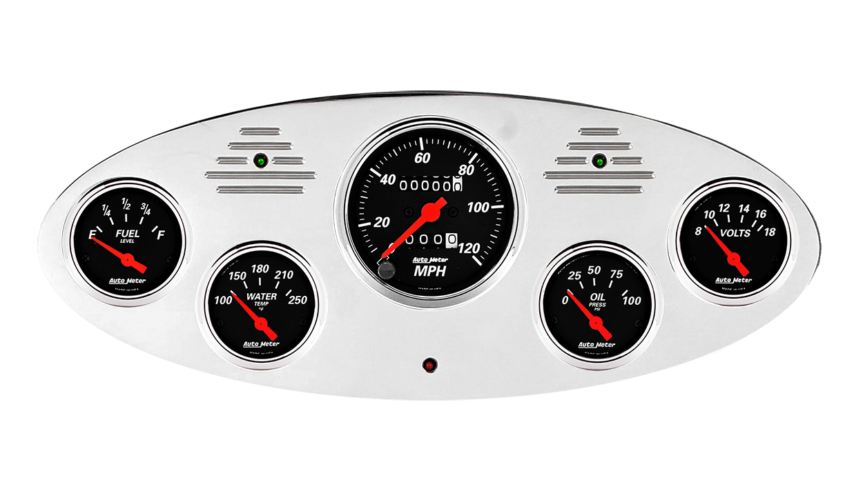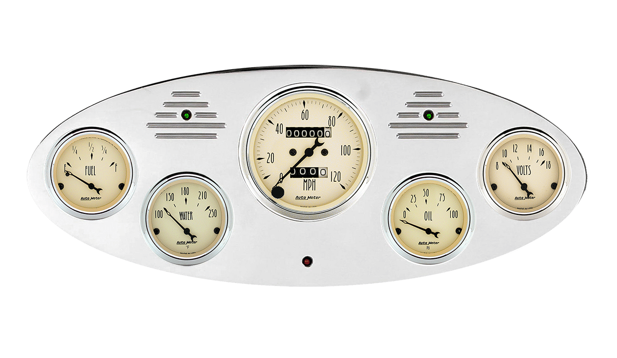 Includes aluminum dash insert, Auto Street Rod series gauges & turn signal/high beam indicators.