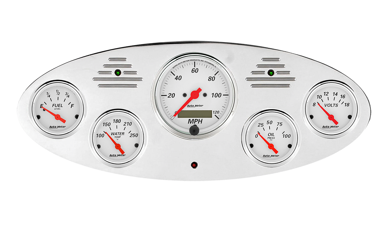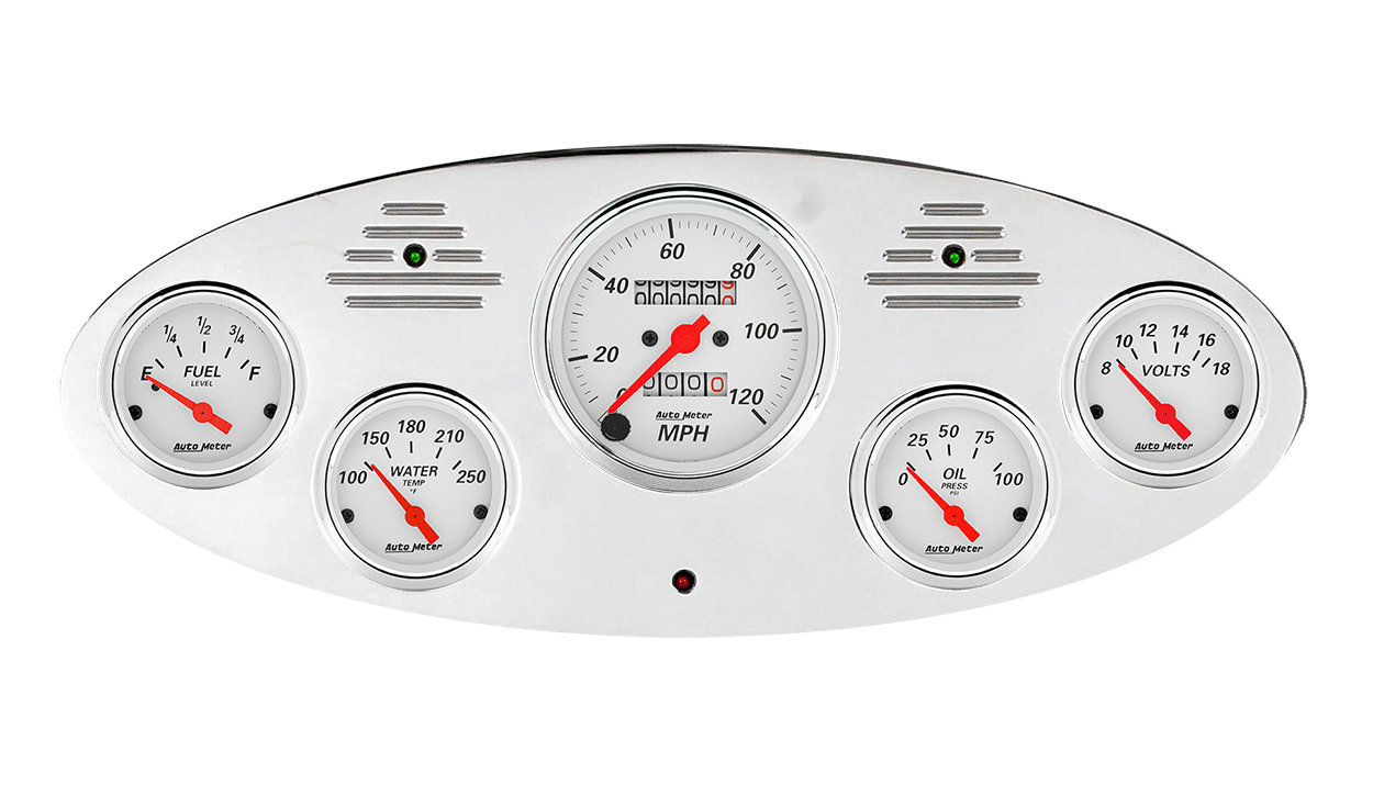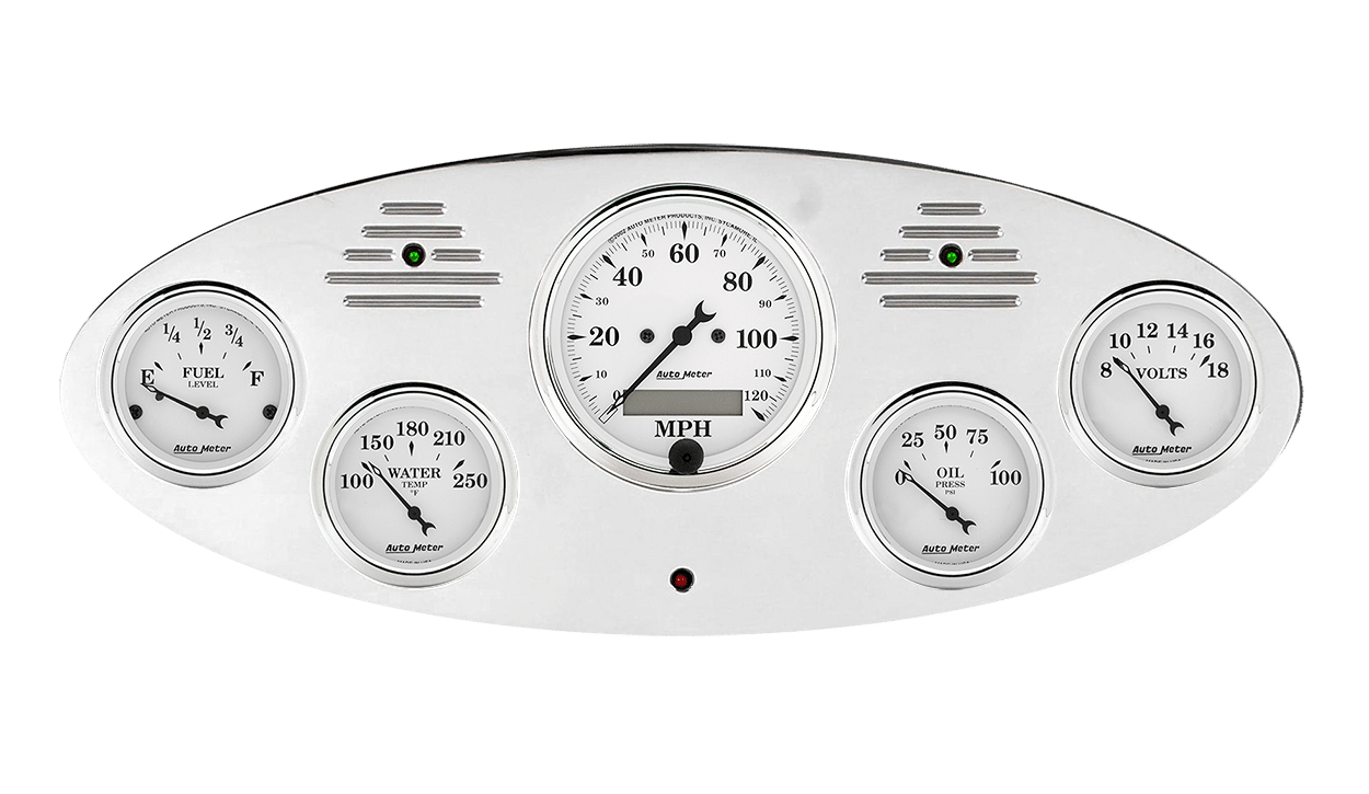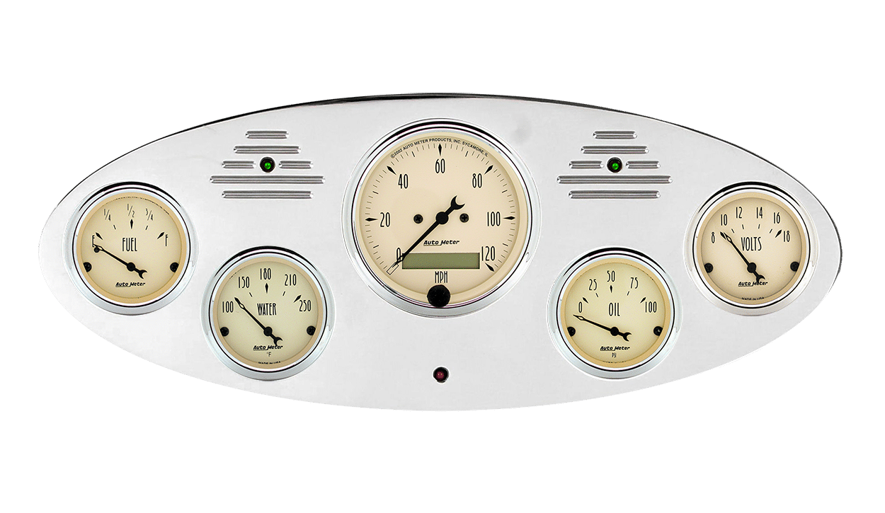 Includes aluminum dash insert, Auto Street Rod series gauges & turn signal/high beam indicators.