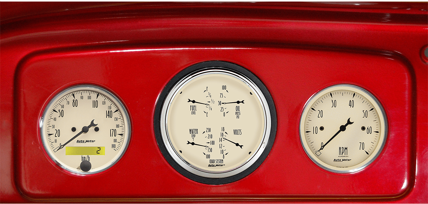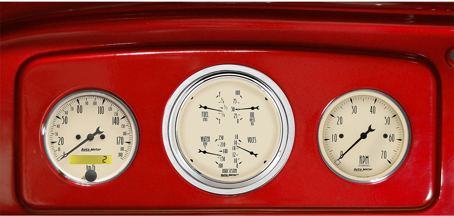 Includes aluminum adapter panels and Auto Meter Antique Beige gauges.