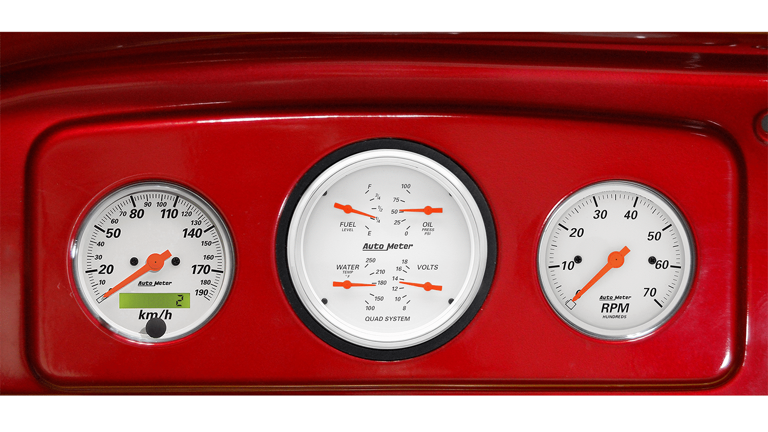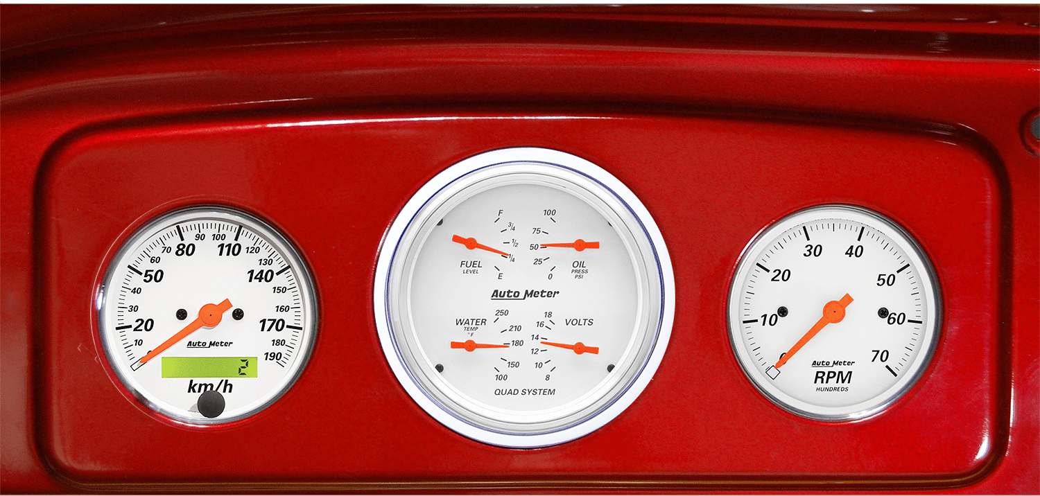 Includes aluminum adapter panels and Auto Meter Arctic White gauges.