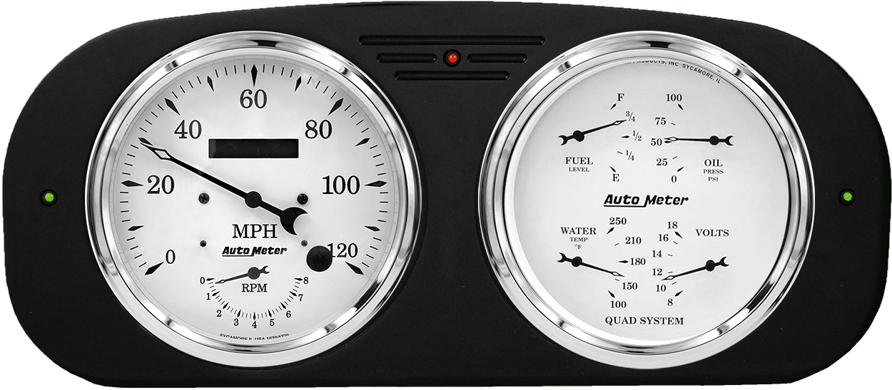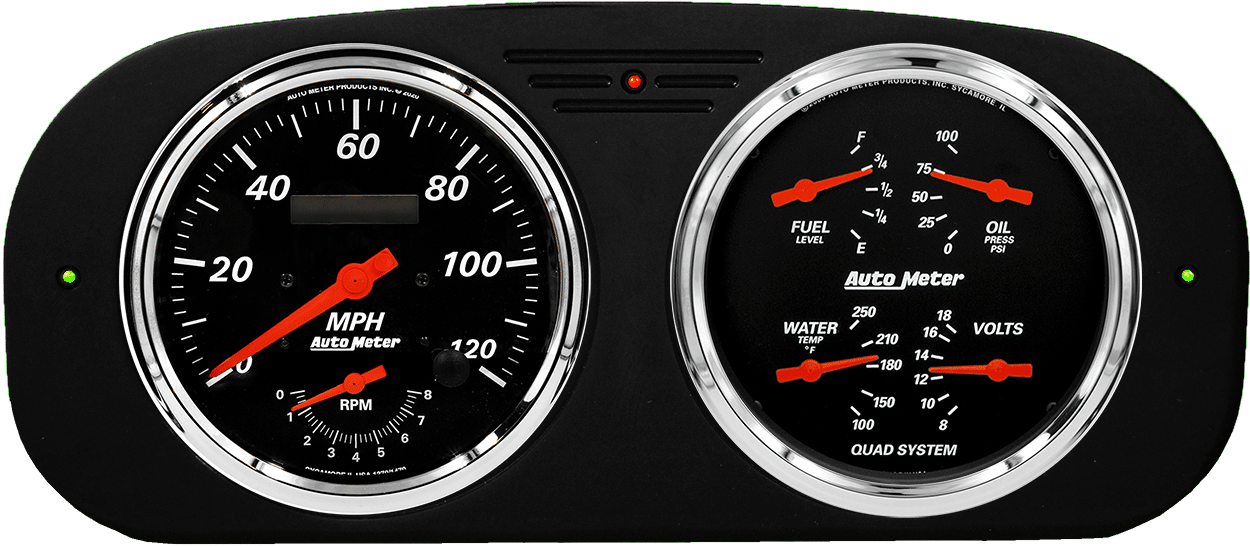 - 5” Quad gauge (100 PSI electric oil pressure, 100-250 F electric water temperature, 8-18 VDC voltmeter, & 240-33 ohm fuel level)