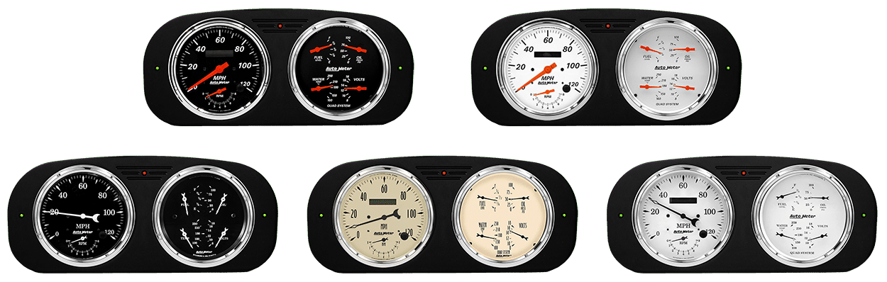 Includes aluminum gauge panels, AutoMeter Street Rod series gauges, & turn signal indicators.