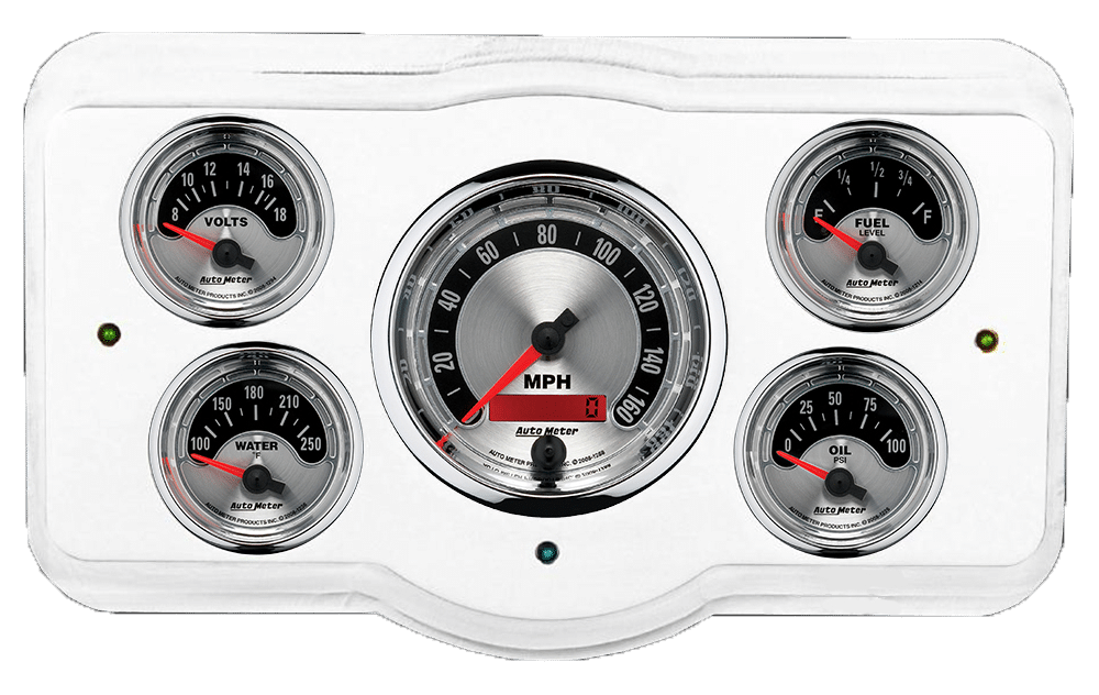 Includes aluminum gauge panel, Auto Meter American Muscle gauges, & LED lights (turn signal & high beam indicators).