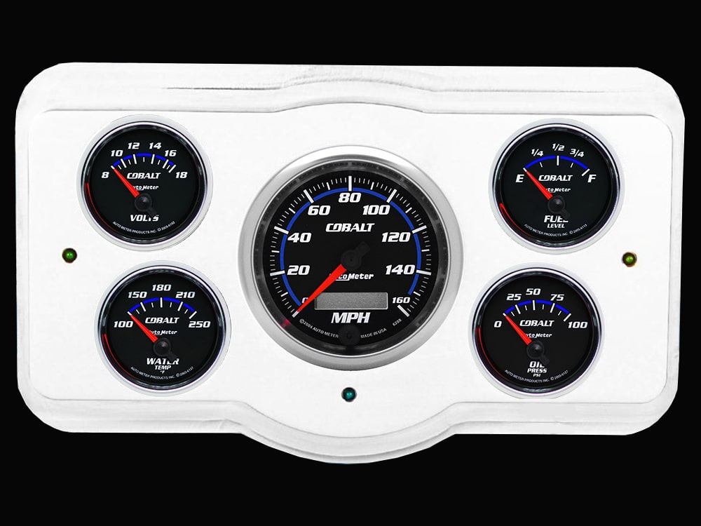 Includes aluminum dash insert, Auto Meter Cobalt gauges, & turn signal/high beam indicators.