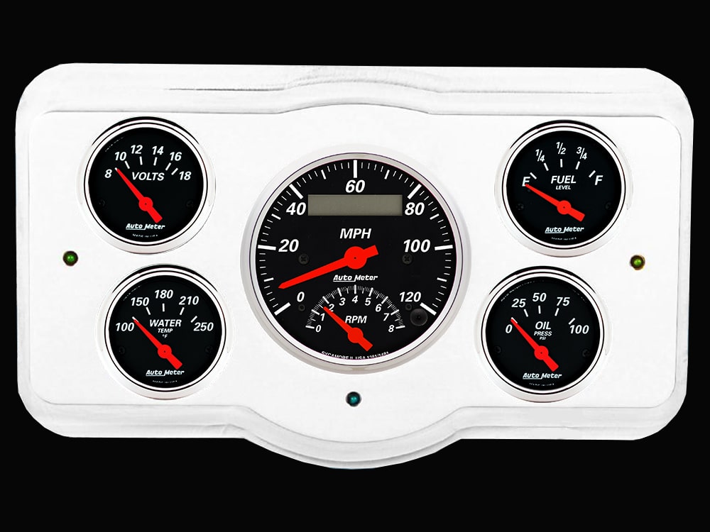 Includes aluminum dash insert, Auto Meter Street Rod series gauges and LED lights (turn signal & high beam indicators.).