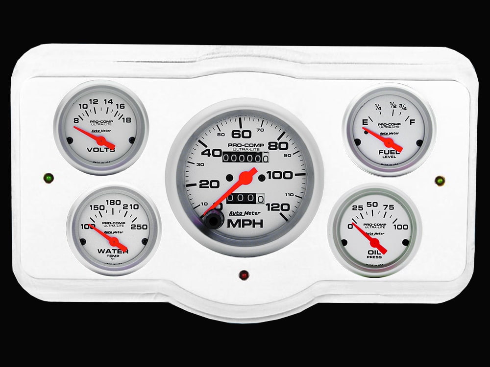 Includes aluminum gauge panel, Auto Meter Ultra-Lite gauges, & LED lights (turn signal & high beam indicators).