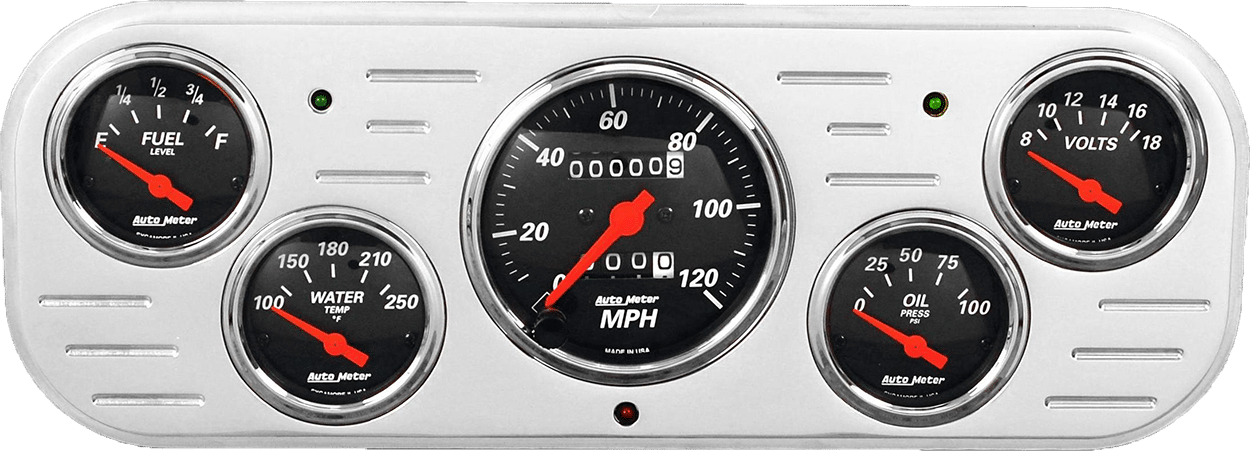 Includes aluminum dash insert, Auto Street Rod series gauges & turn signal/high beam indicators.