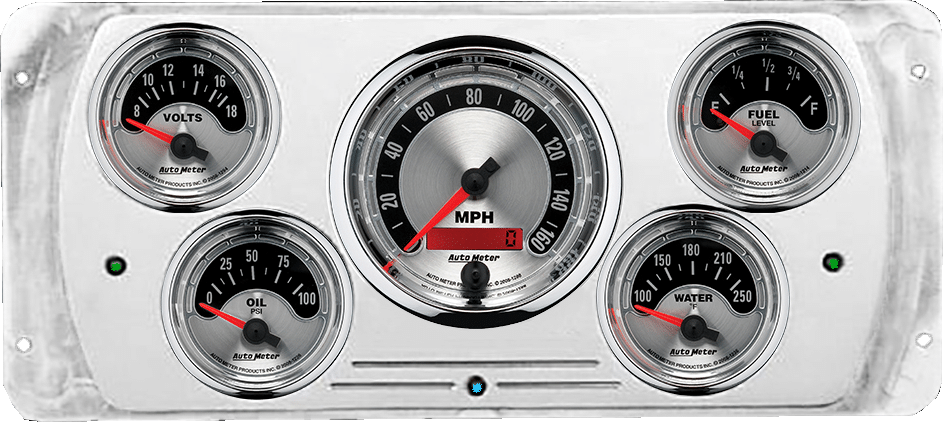 Includes aluminum gauge panel, Auto Meter American Muscle gauges, & LED lights (turn signal & high beam indicators).