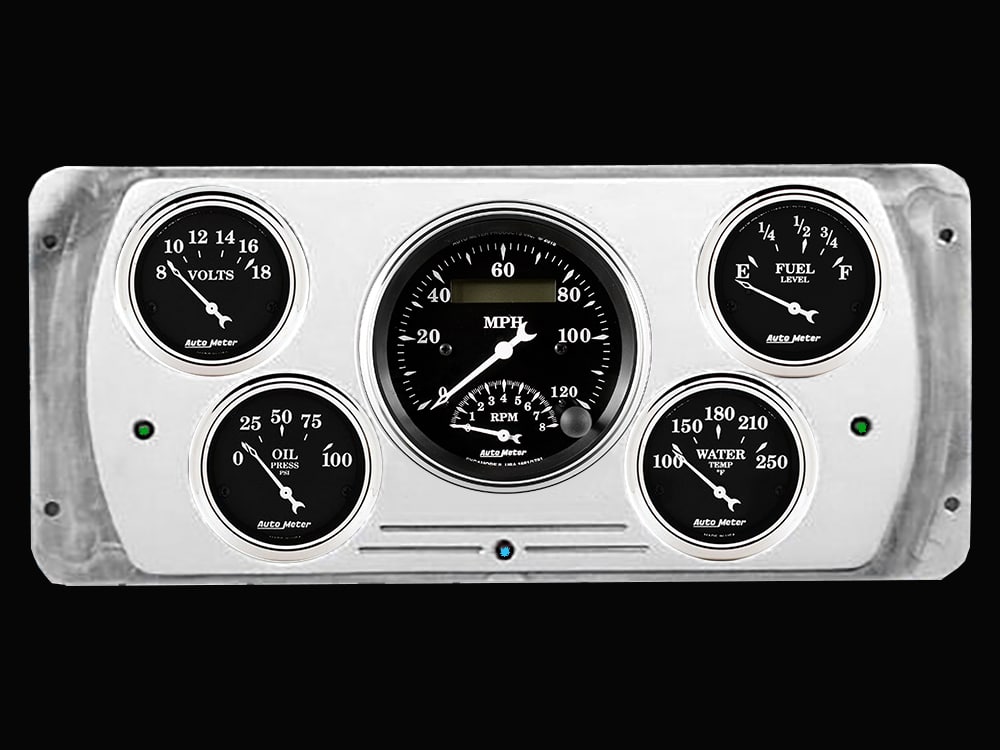 Includes aluminum dash insert, Auto Meter Street Rod series gauges and LED lights (turn signal & high beam indicators.).