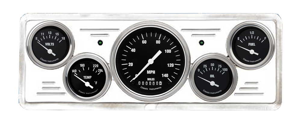 Includes aluminum dash insert, Classic Instruments gauges & LED lights (turn signal & high beam indicators).