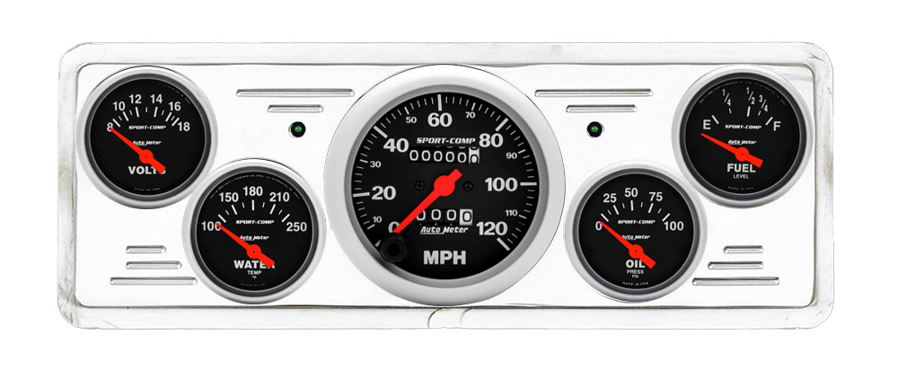 Includes aluminum gauge panel, Auto Meter Sport-Comp gauges, & LED lights (turn signal & high beam indicators).