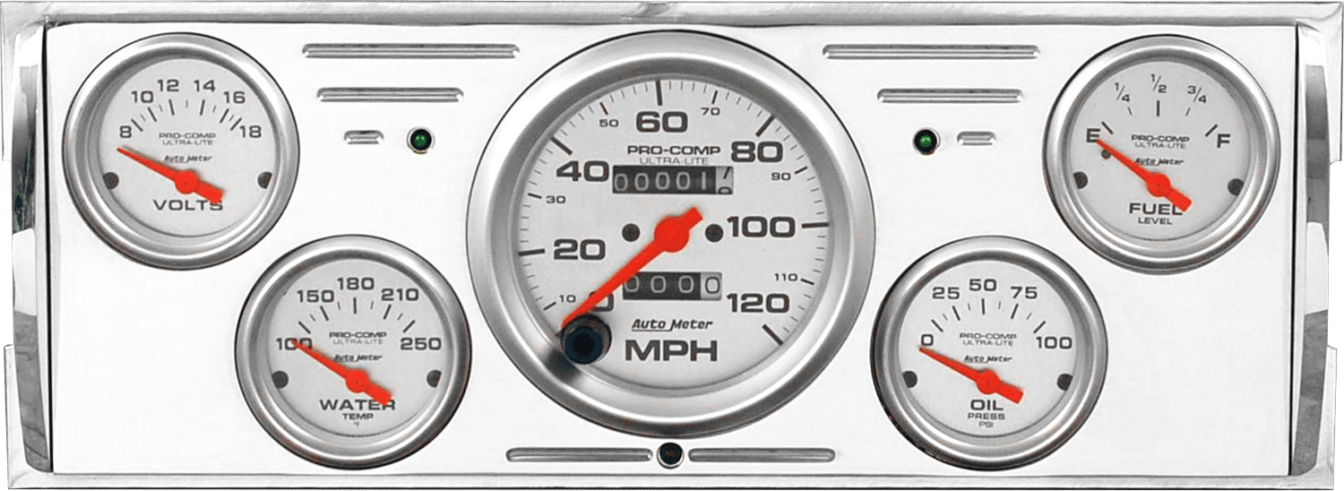Includes aluminum gauge panel, Auto Meter Ultra-Lite gauges, & LED lights (turn signal & high beam indicators).