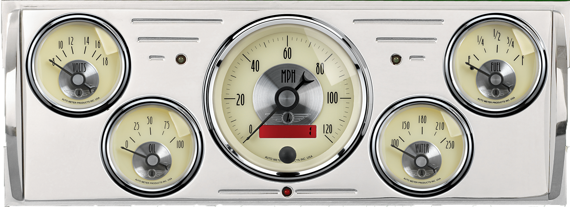 Includes aluminum dash insert, Auto Meter Prestige series gauges & turn signal/high beam indicators.