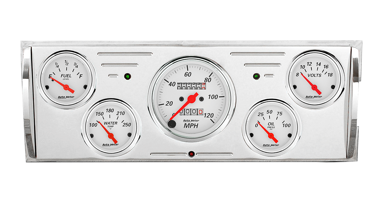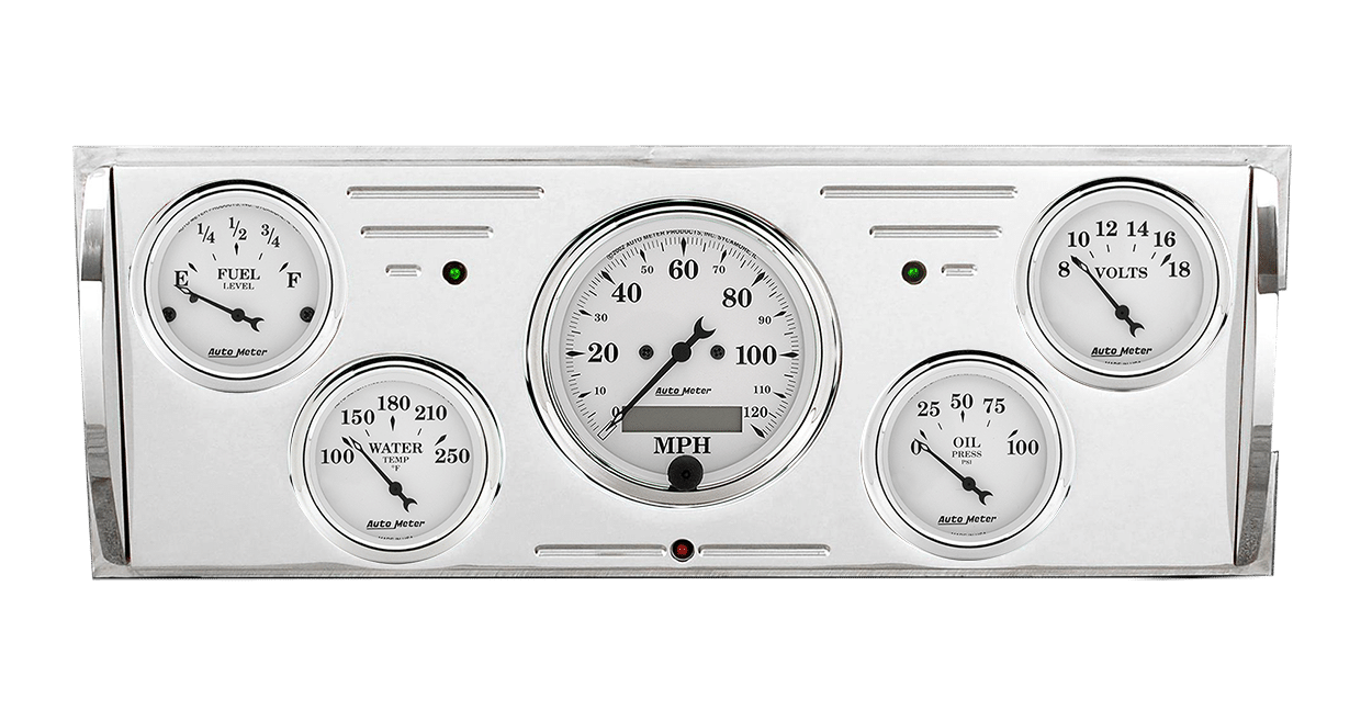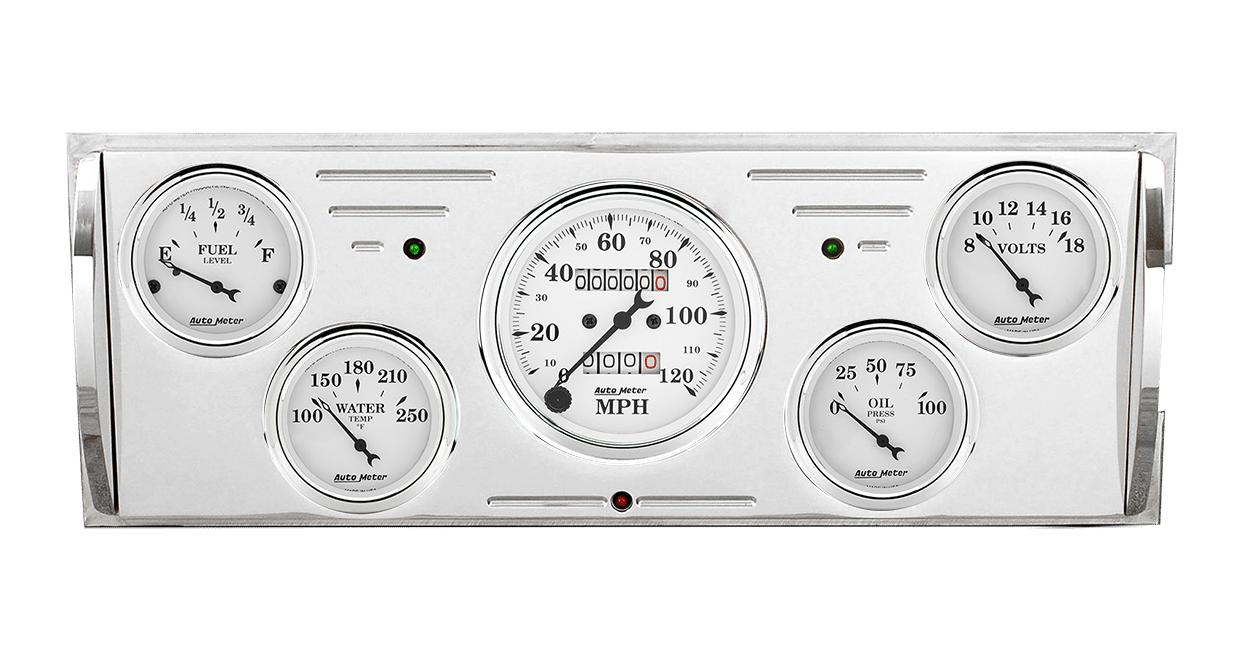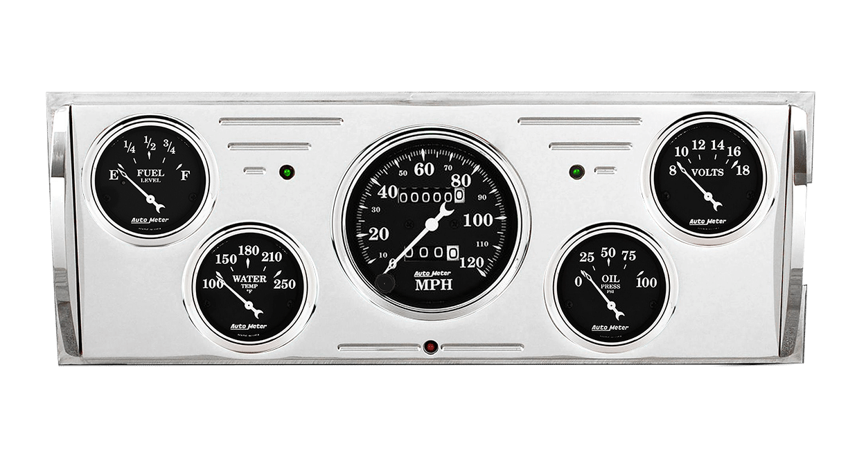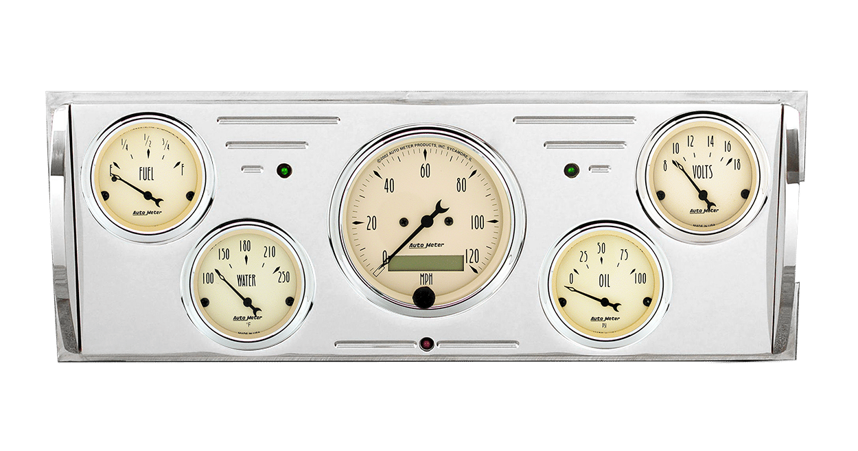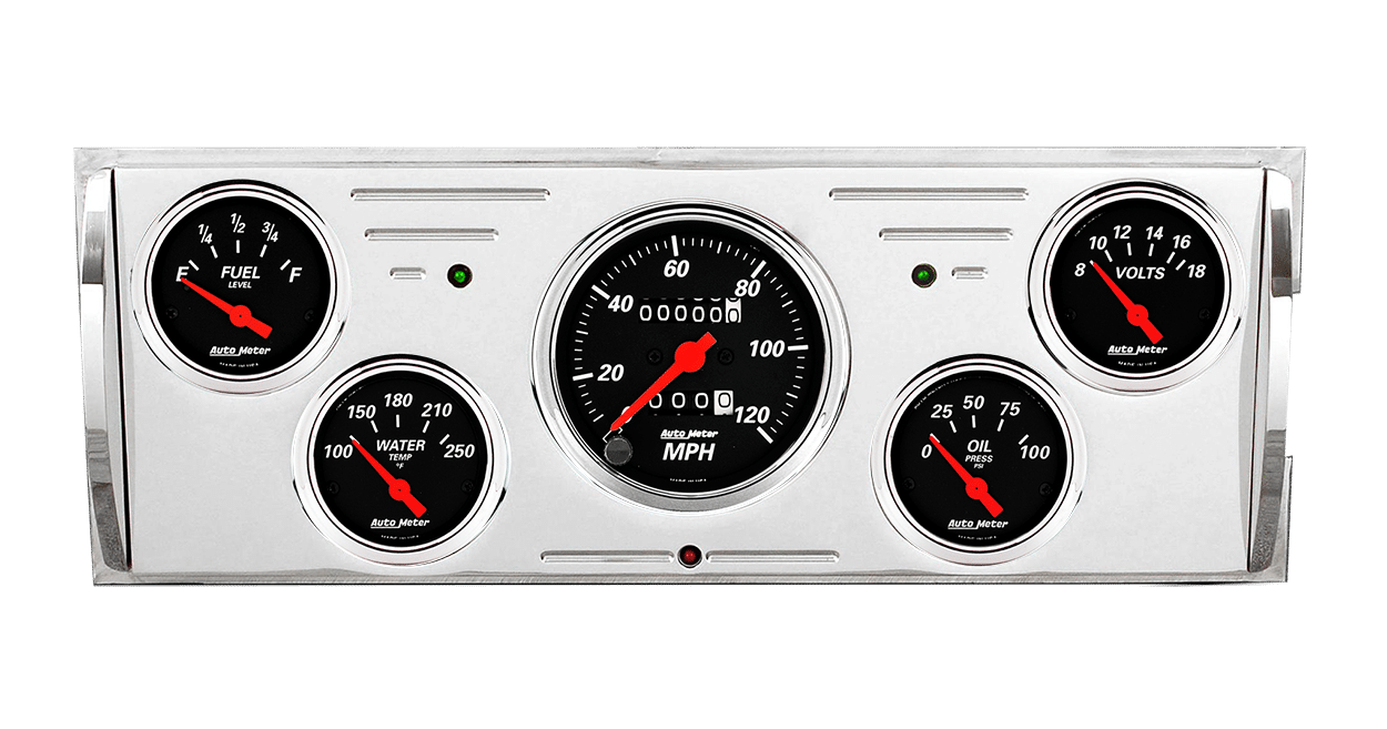 Includes aluminum dash insert, Auto Street Rod series gauges & turn signal/high beam indicators.