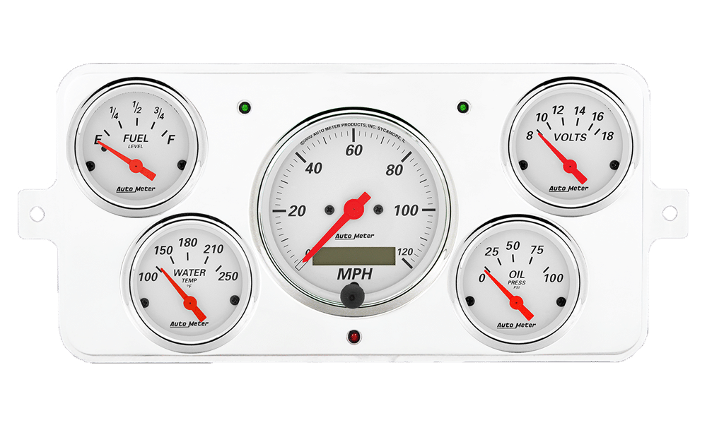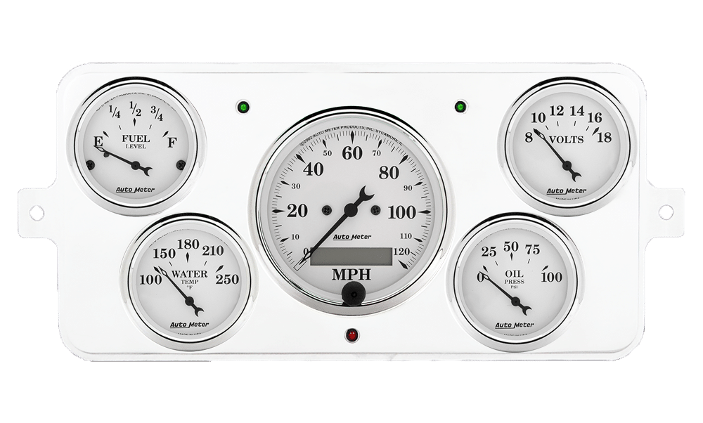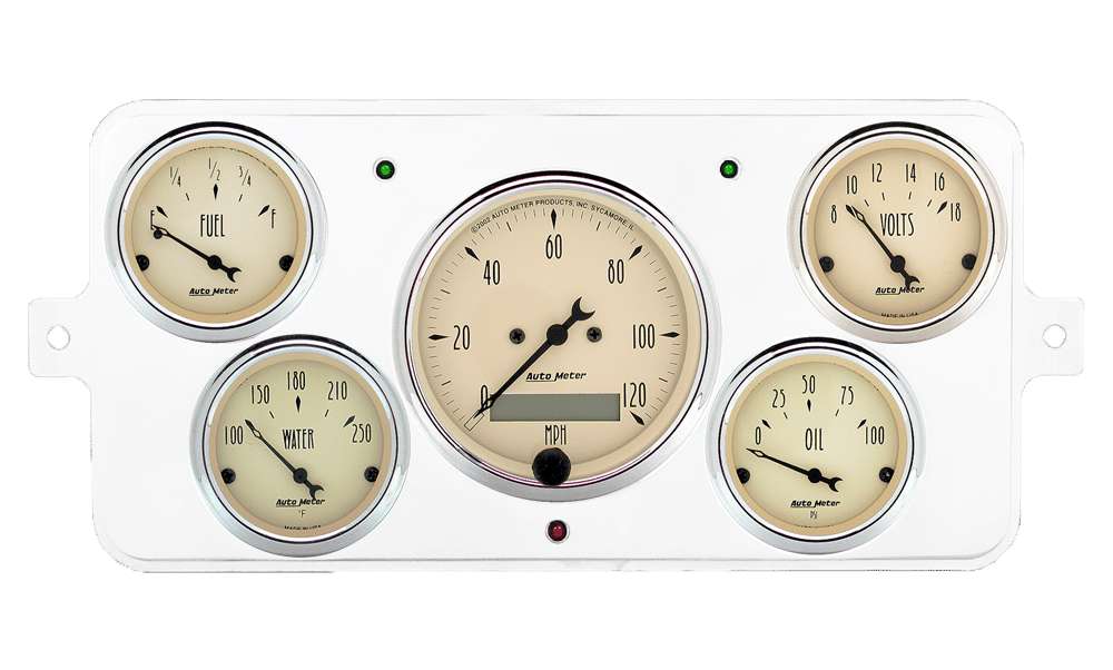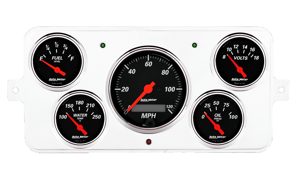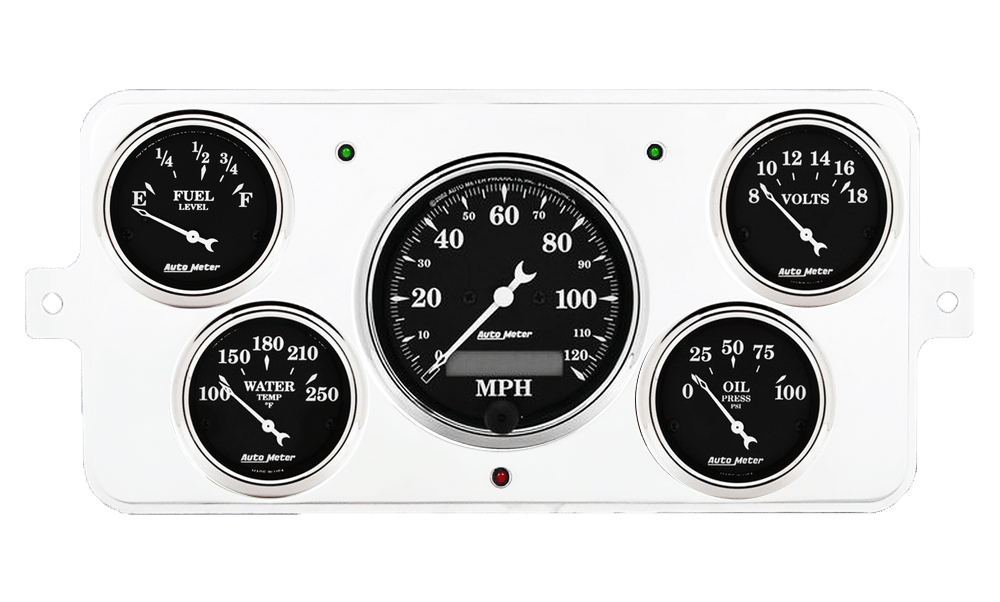 Includes aluminum dash insert, AutoMeter Street Rod series gauges & turn signal/high beam indicators.