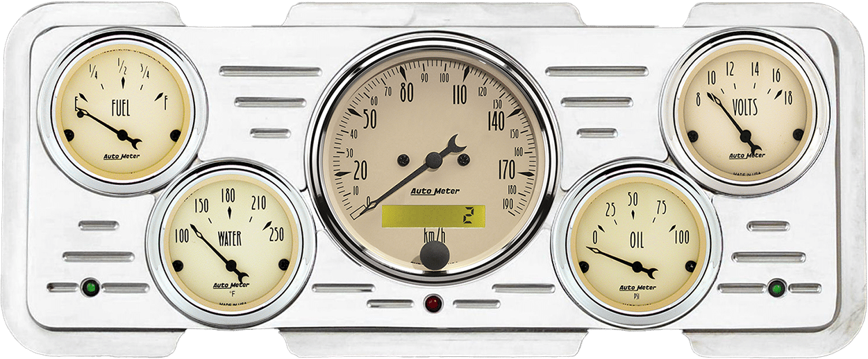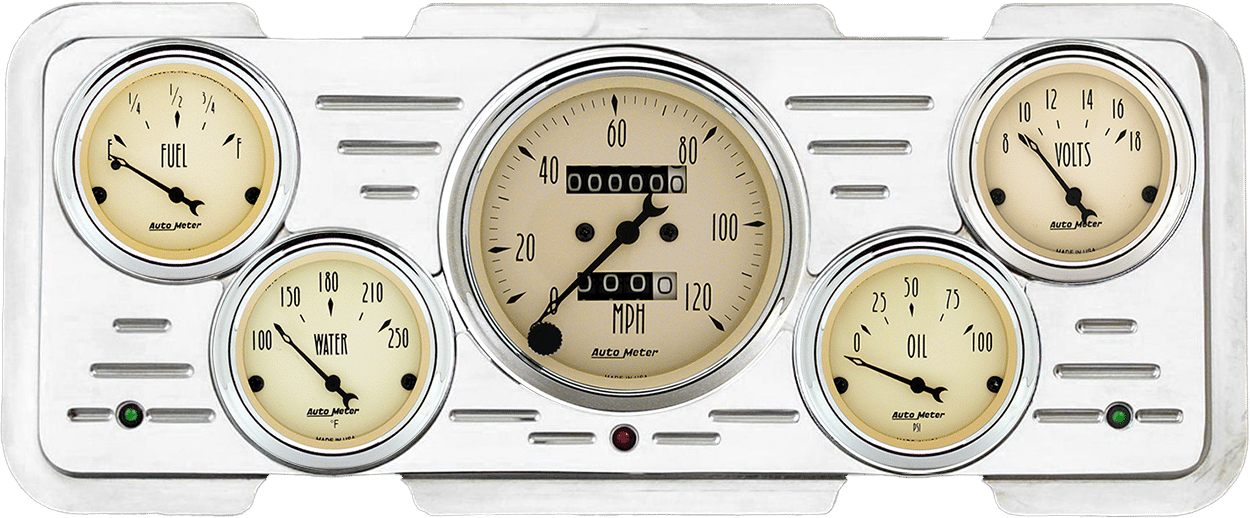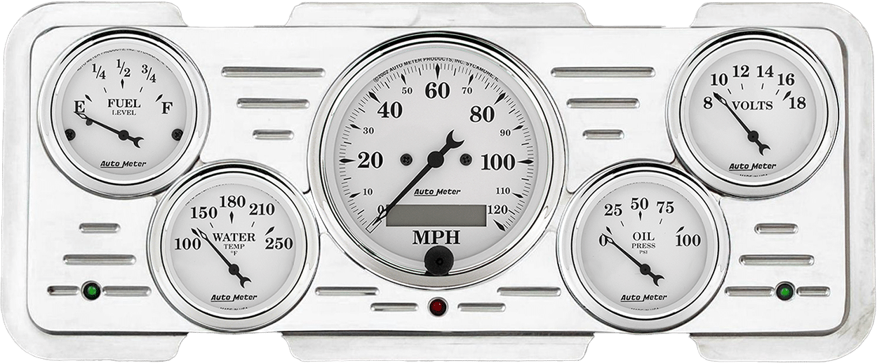 Includes aluminum dash insert, Auto Street Rod series gauges & turn signal/high beam indicators.