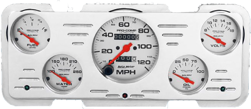 Includes aluminum gauge panel, Auto Meter Ultra-Lite gauges, & LED lights (turn signal & high beam indicators).