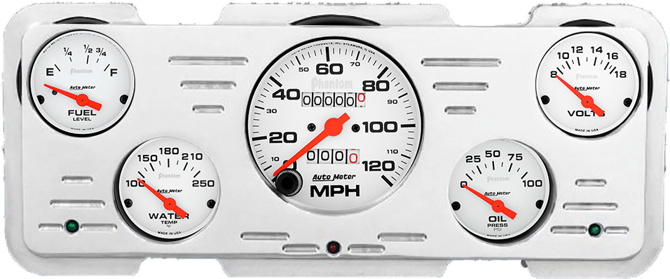 Includes aluminum gauge panel, Auto Meter Phantom gauges, & LED lights (turn signal & high beam indicators).