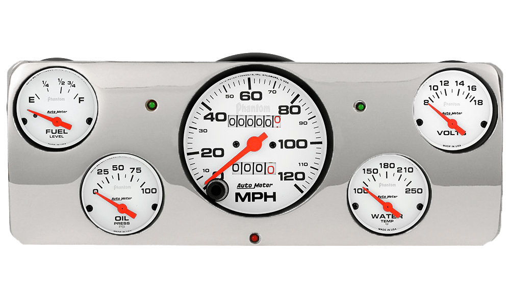 Includes aluminum gauge panel, Auto Meter Phantom gauges, & LED lights (turn signal & high beam indicators).