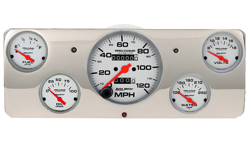 Includes aluminum gauge panel, Auto Meter Ultra-Lite gauges, & LED lights (turn signal & high beam indicators).