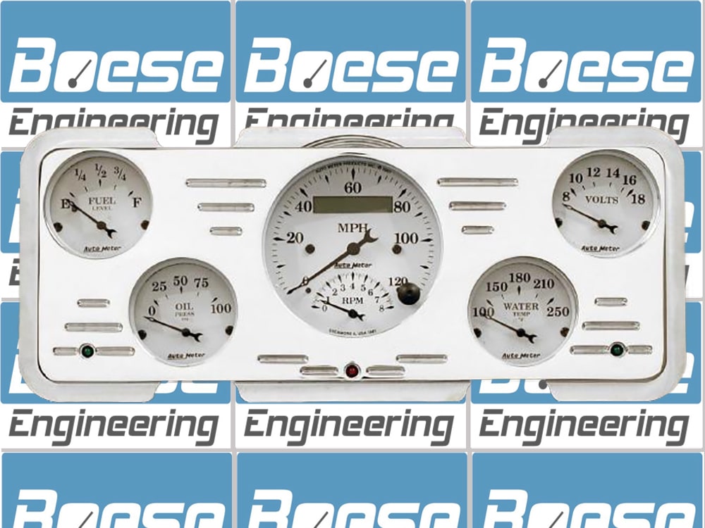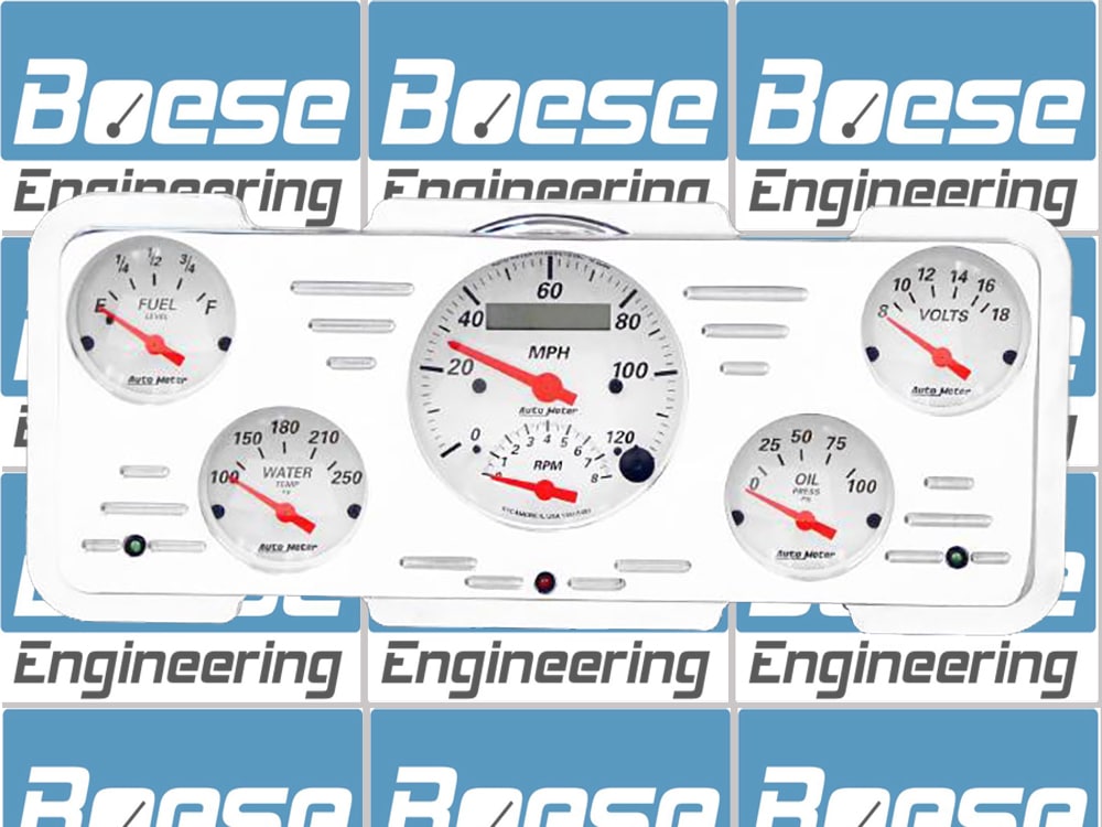 Includes aluminum dash insert, Auto Meter Street Rod series gauges and LED lights (turn signal & high beam indicators.).