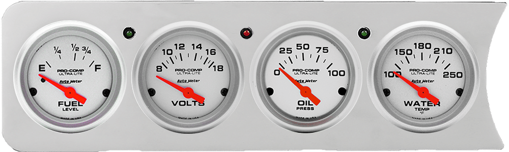 Includes aluminum 4 gauge panel, Auto Meter Ultra-Lite gauges, & LED lights (turn signal & high beam indicators).