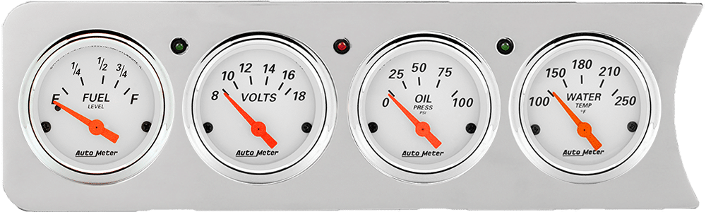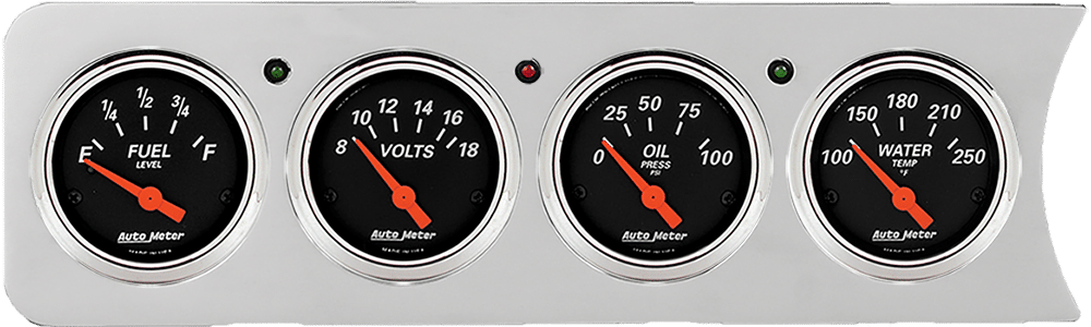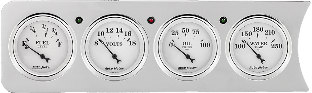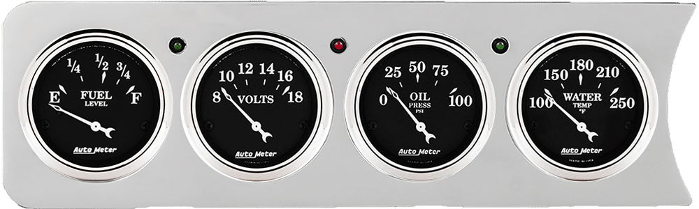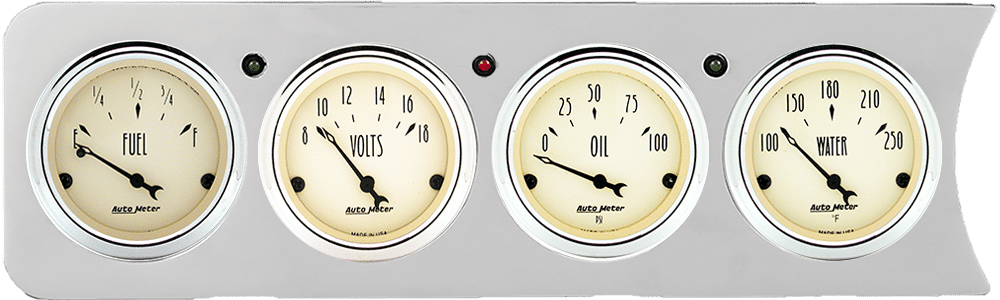 Includes aluminum 4 gauge dash panel & 2 1/6″ AutoMeter Street Rod series gauges.