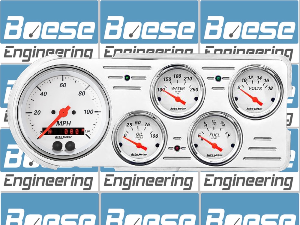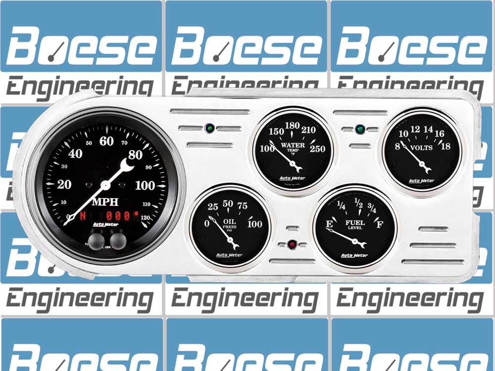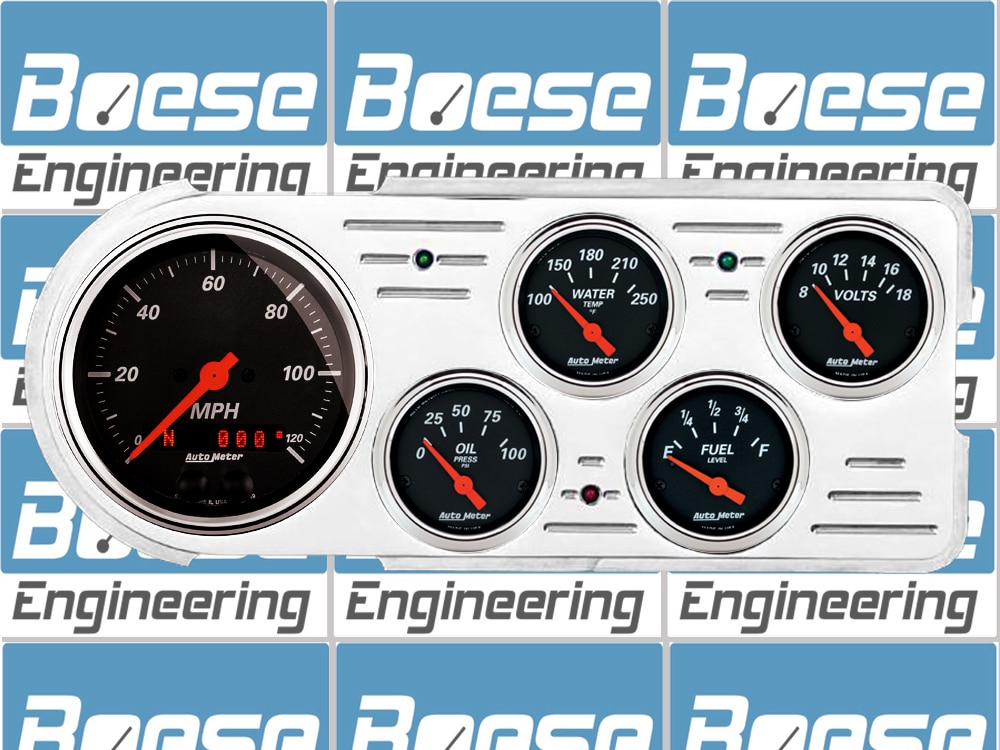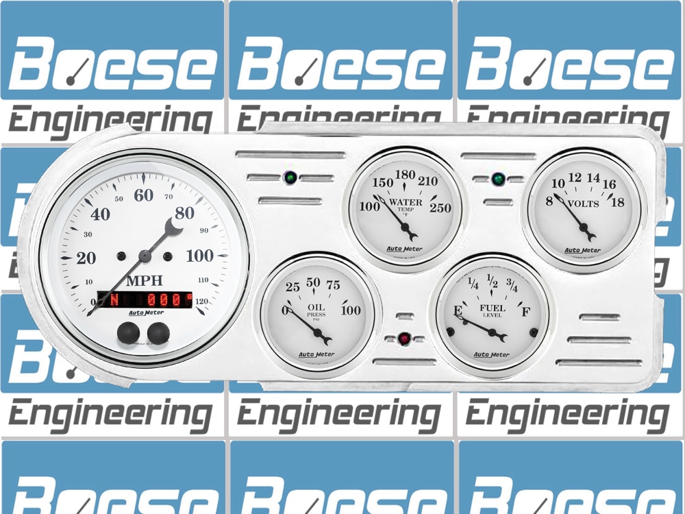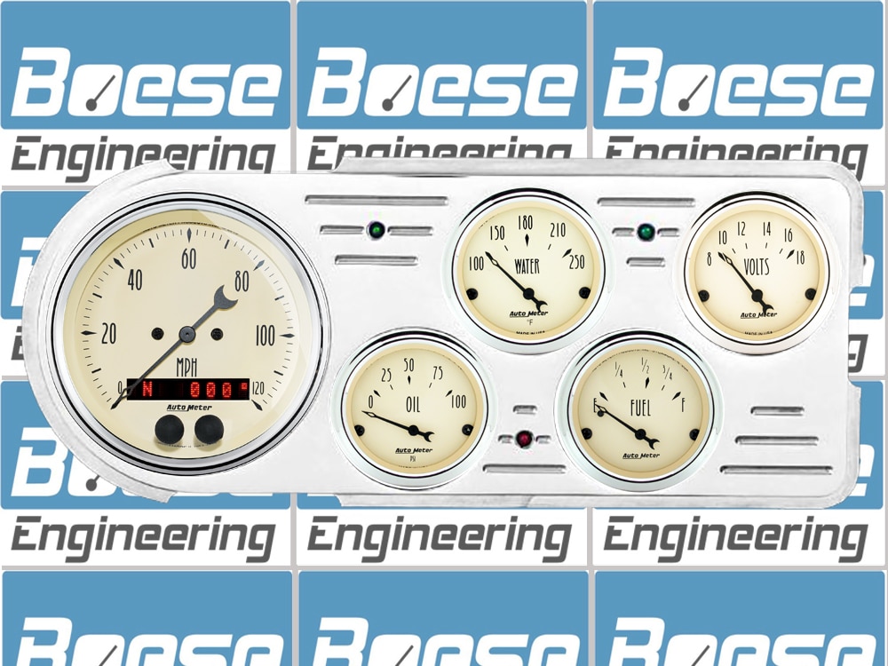 Includes aluminum dash insert, Auto Meter Street Rod series gauges and LED lights (turn signal & high beam indicators.).