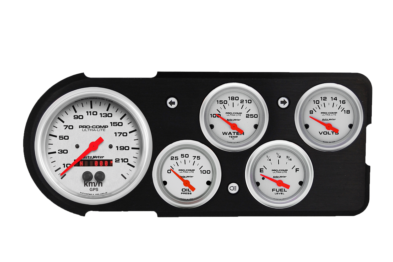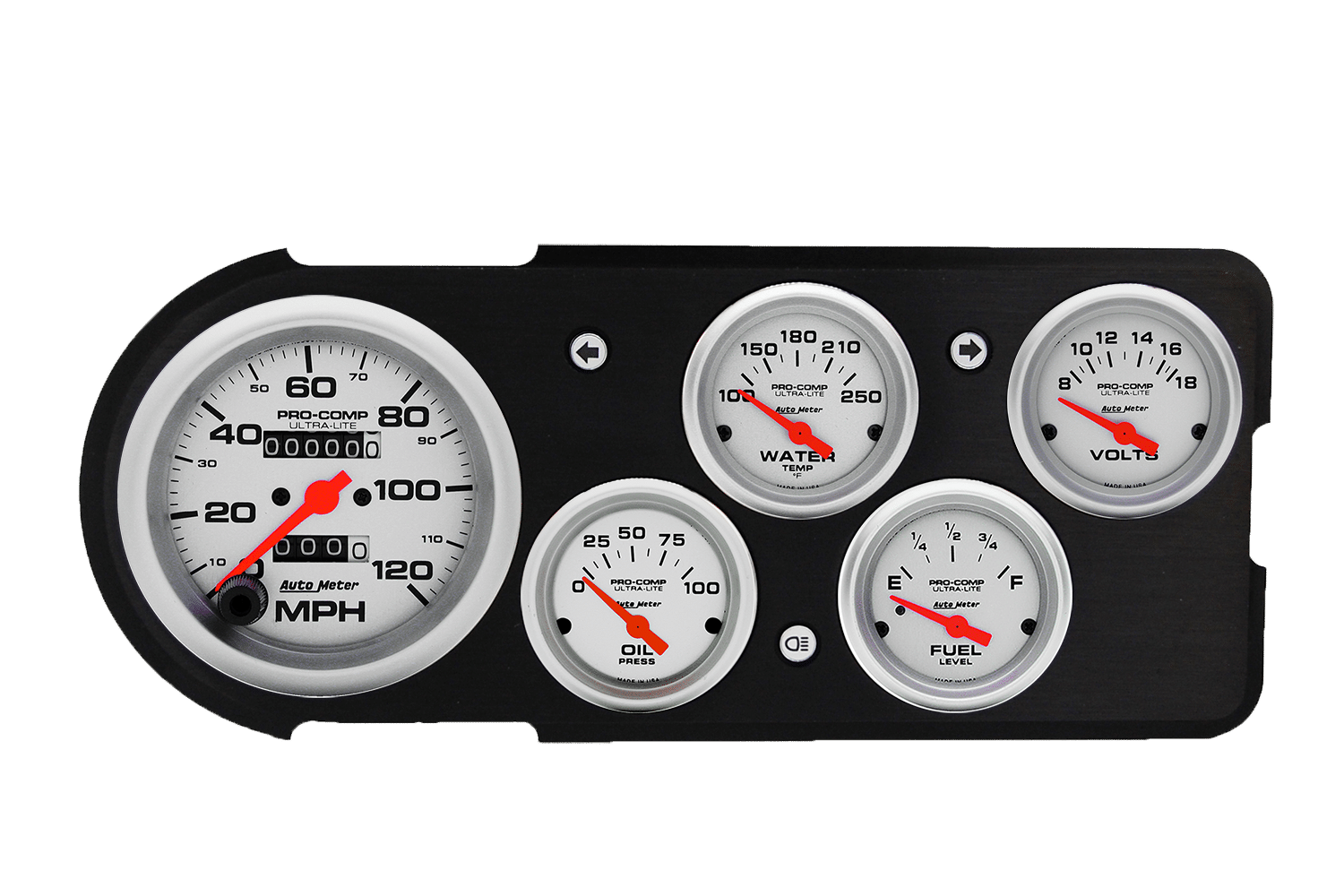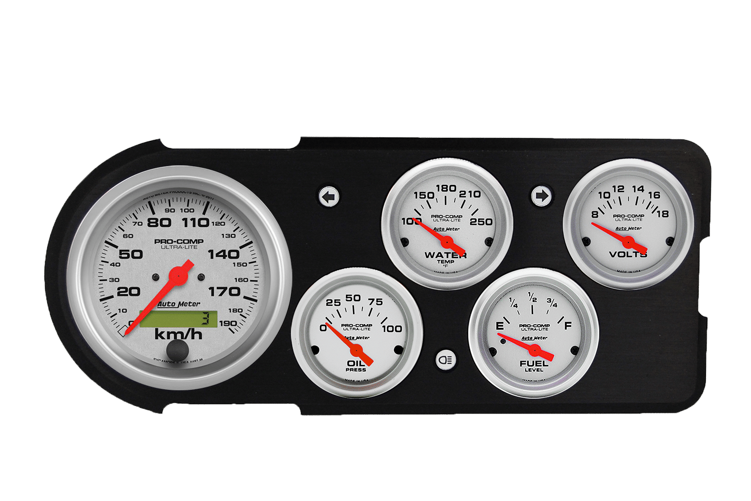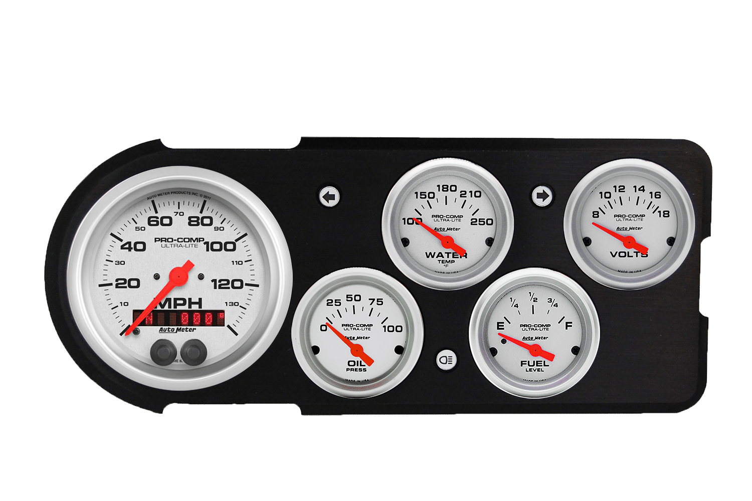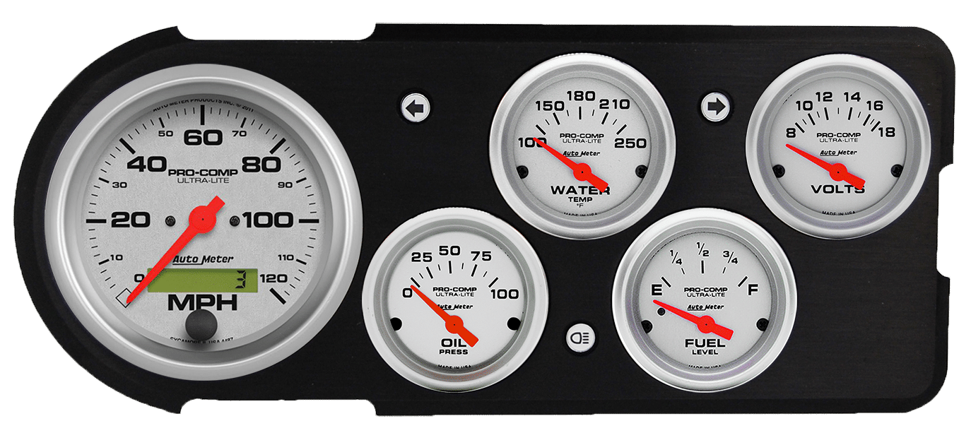 Includes brushed & black anodized aluminum gauge panel, Auto Meter Ultra-Lite gauges, & LED lights (turn signal & high beam indicators).