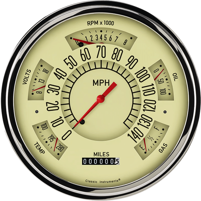 1949-50 Tan “Shoebox” Six-Instrument (Speedometer, Tachometer, Fuel [240-33 ohm], Temperature, Voltage, and Oil) Package. • Lighting • LEDs • Warm white in color • Molded “light intensifier” ring for bright, even lighting • Built-in LED dimmer • No additional LED dimmer is necessary • The brightness of the LEDs can be adjusted with a potentiometer on the back of the cluster • Green turn signal indicators in the left and right sides of cluster • Red LED “halo” high beam indicator hidden at the top of the tachometer • Molded plastic back housing Zeus Speedometer Technology built-in • Push button calibration • Built-in ECM signal filter switch • SNPB included • Standard Ford sender kit included, SNFD *Model-specifc mounting hardware included.Additional information