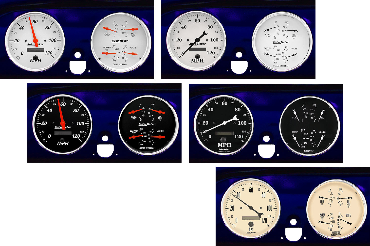 Includes aluminum adapter rings & Auto Meter Street Rod series gauges.
