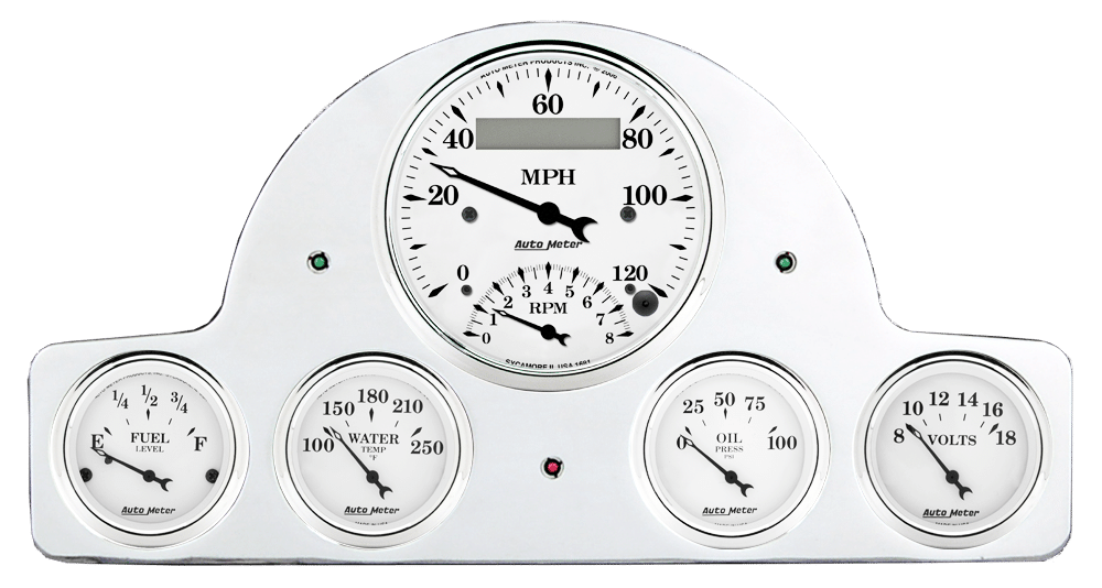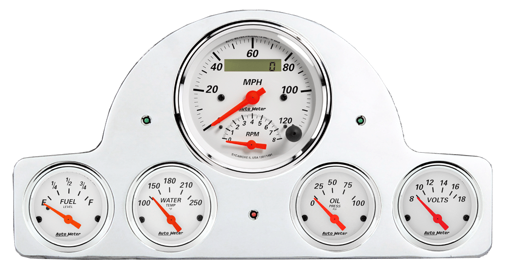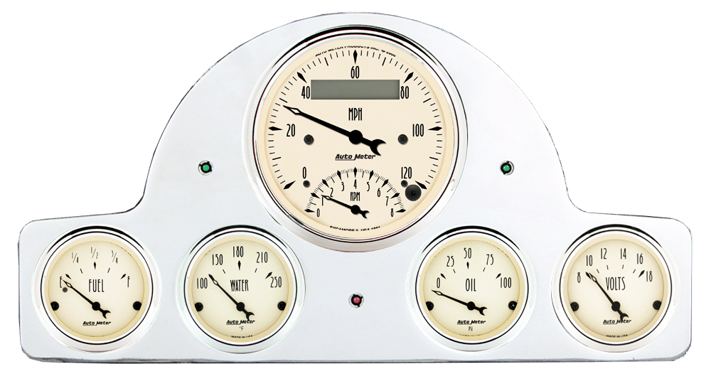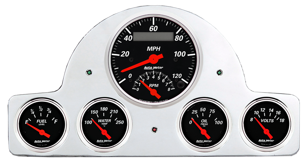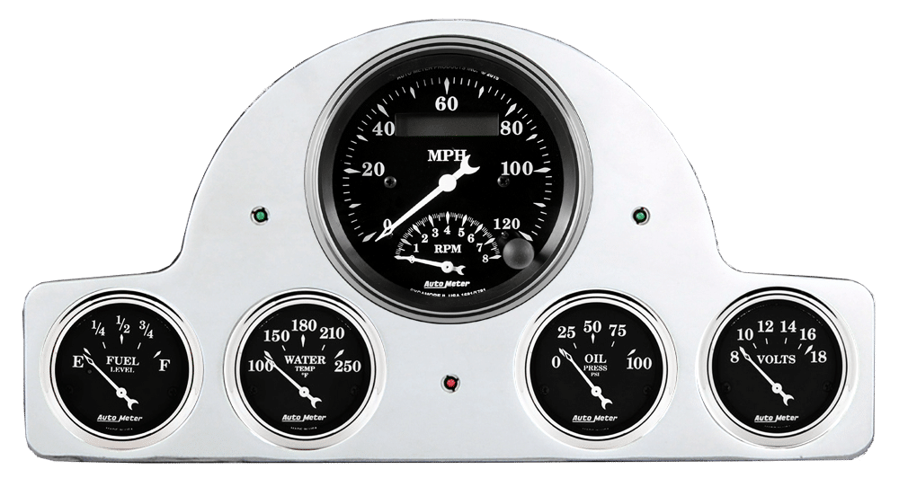 Includes aluminum dash insert, Auto Meter Street Rod series gauges and LED lights (turn signal & high beam indicators.).