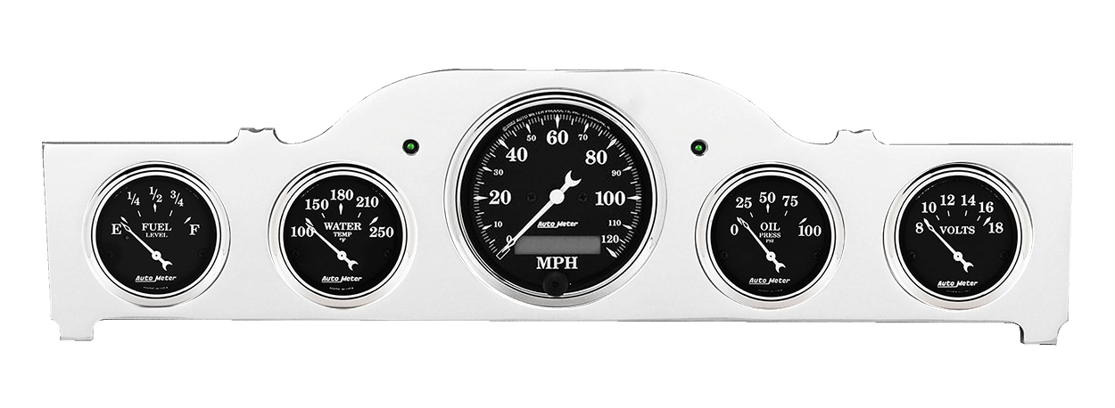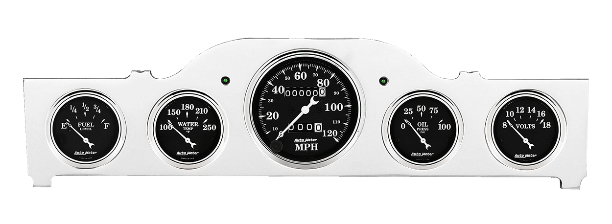 Includes aluminum gauge panel, Auto Meter Old Tyme Black 5 gauge kit, & led lights (turn signal indicators).