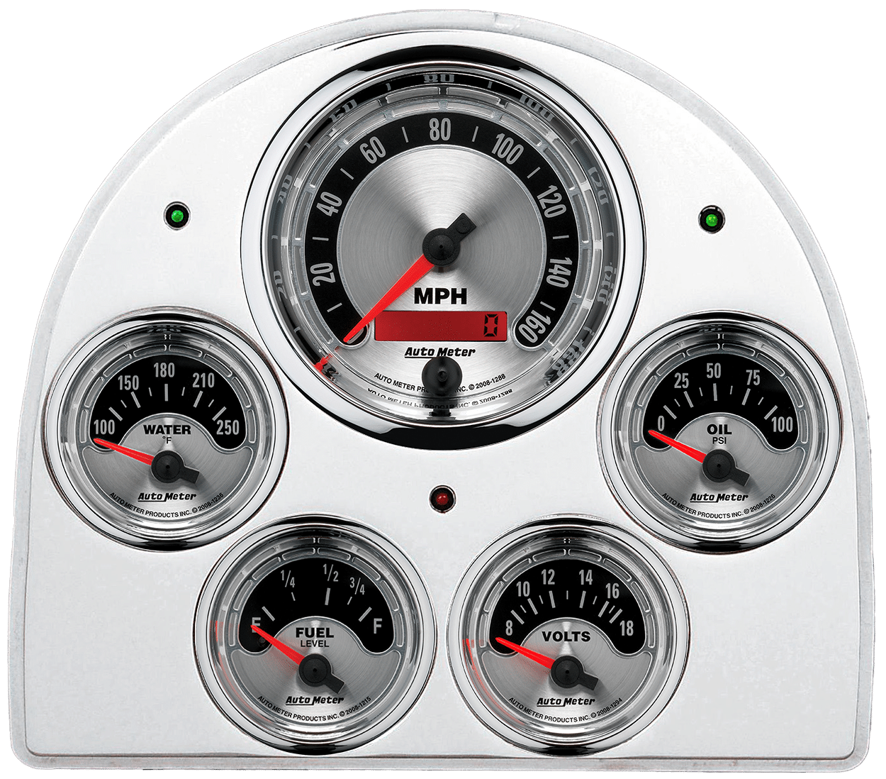Includes aluminum gauge panel, Auto Meter American Muscle gauges, & LED lights (turn signal & high beam indicators).