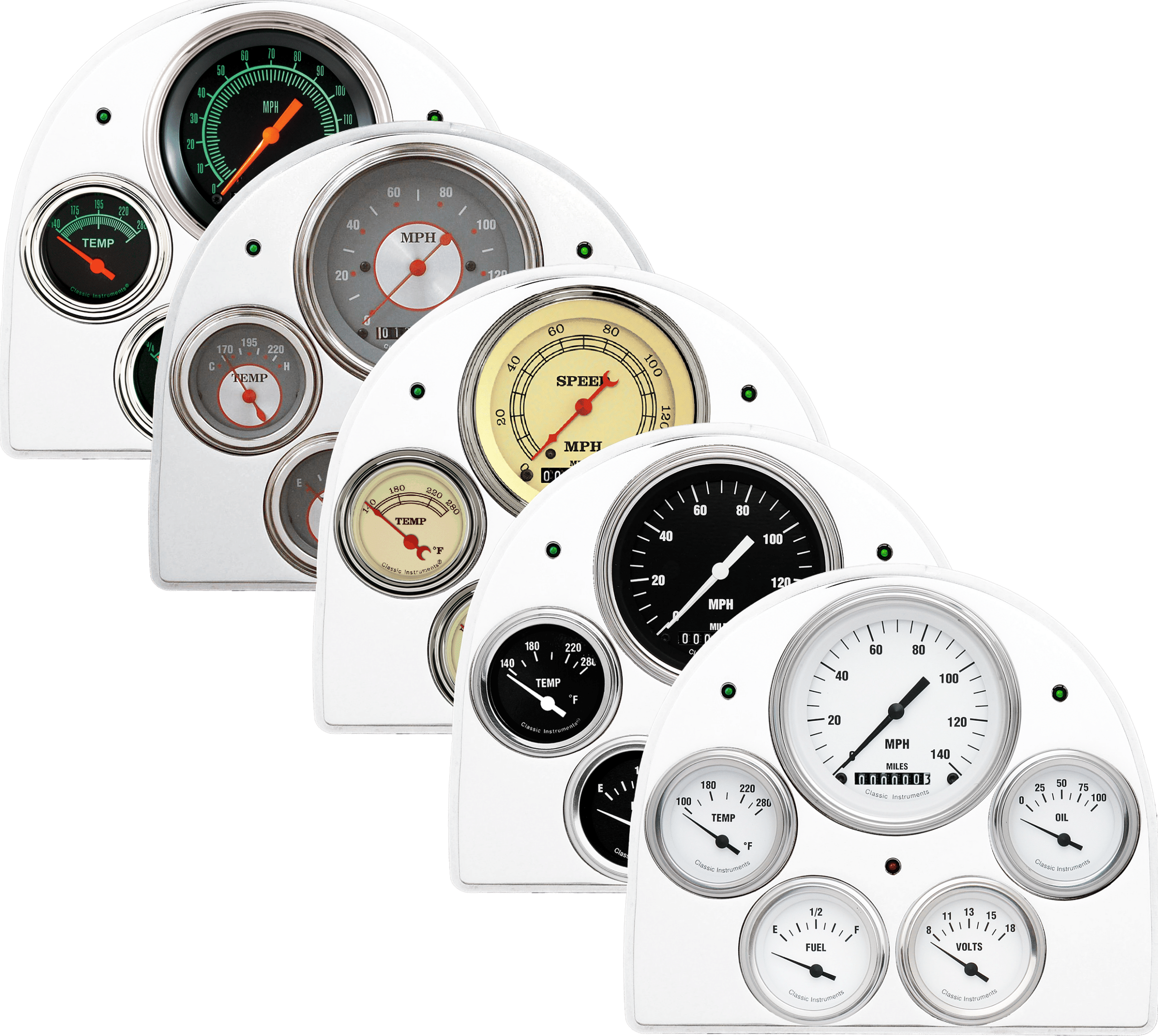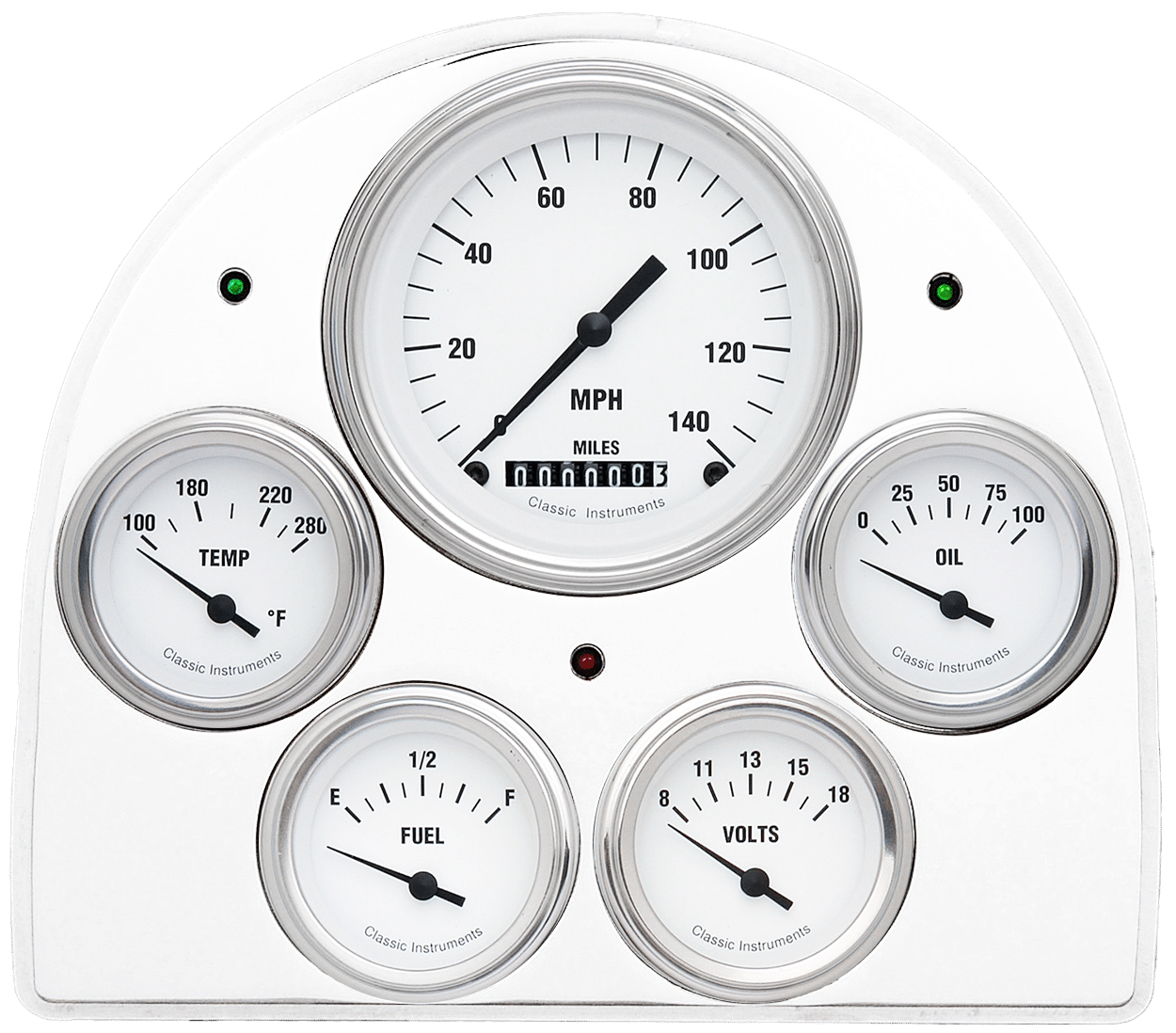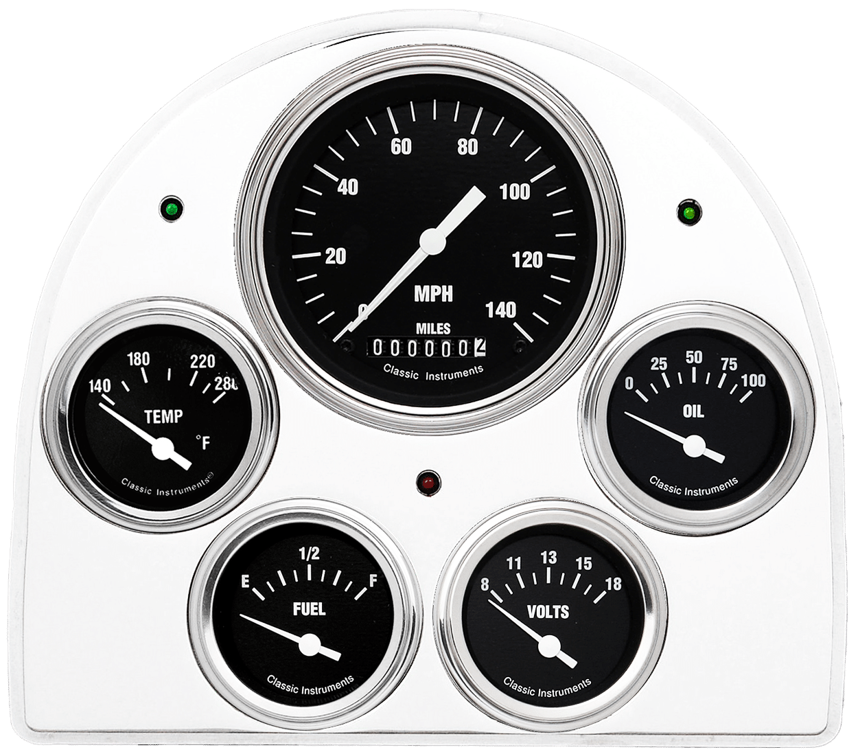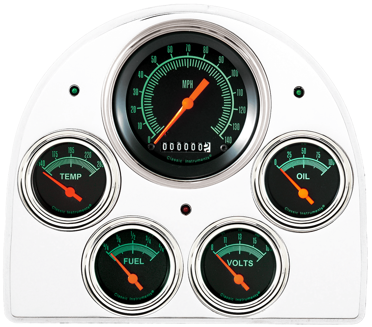 Includes aluminum gauge panel, Classic Instruments gauges & LED lights (turn signal & high beam indicators).