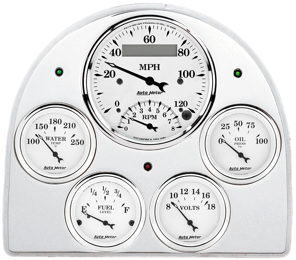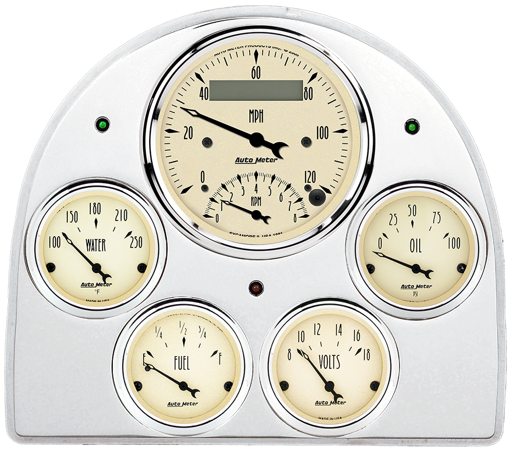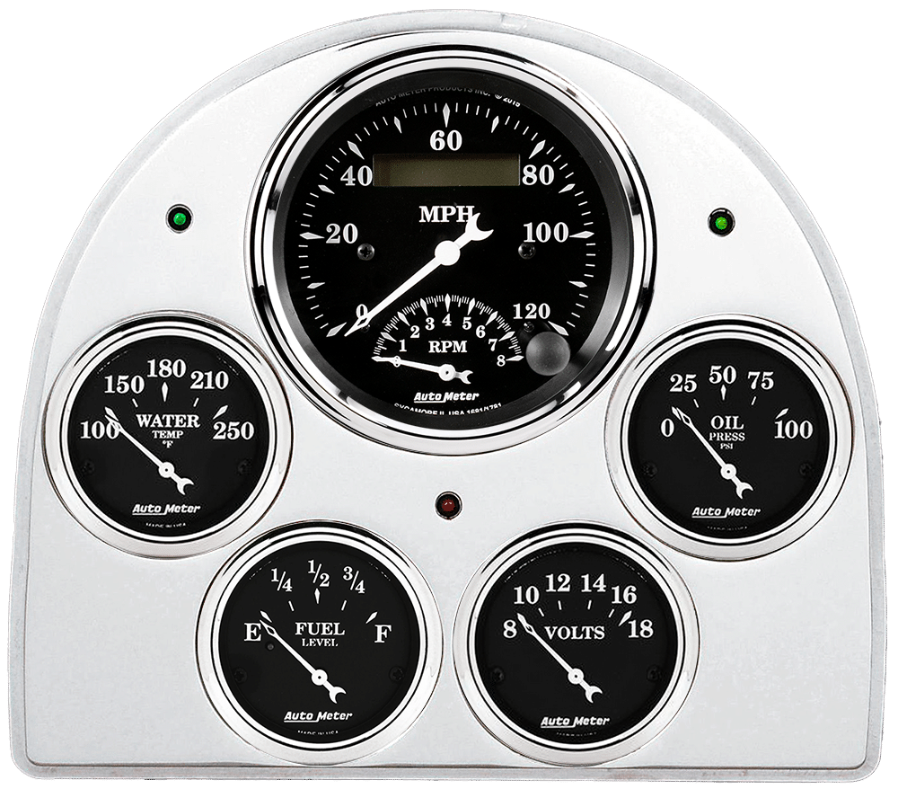 Includes aluminum dash insert, Auto Meter Street Rod series gauges and LED lights (turn signal & high beam indicators.).