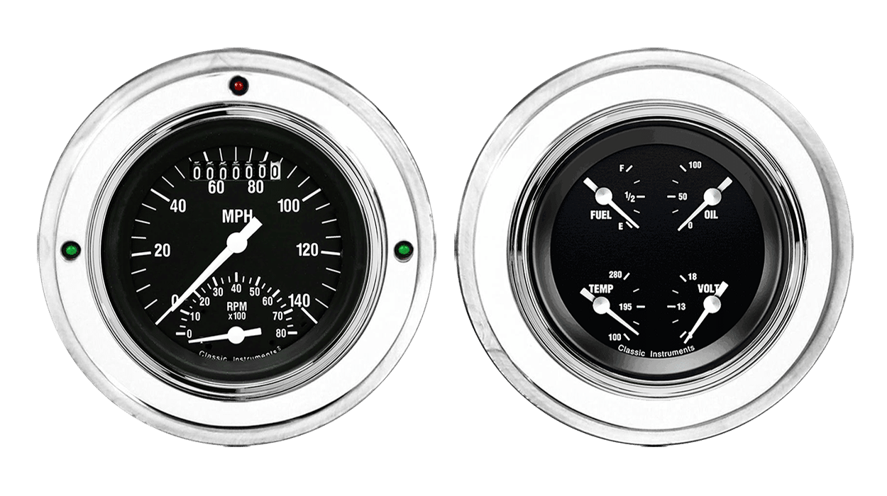 Includes aluminum adapter rings, Classic Instruments Hot Rod series gauges, & LED lights (turn signal & high beam indicators).
