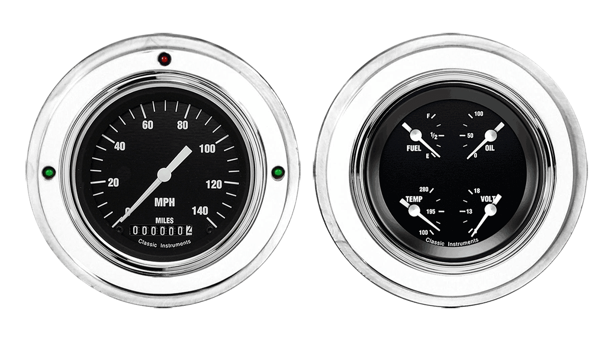 Includes aluminum adapter rings, Classic Instruments Hot Rod series gauges, & LED lights (turn signal & high beam indicators).