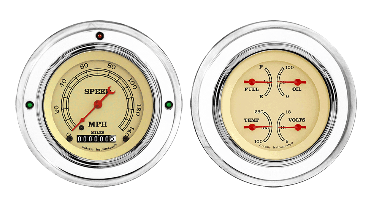 Includes aluminum adapter rings, Classic Instruments Vintage gauges, & LED lights (turn signal & high beam indicators).